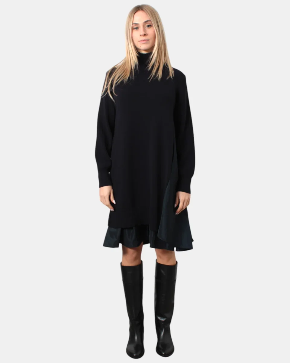 L’abito a collo alto di Meimej presenta collo, fondo e polsi a costine, presenta tasca laterale, sul retro e sul fianco sinistro presenta fodera in contrasto in poliestere, dalla mano calda dovuta alla sua composizione in 100% lana vergine. Si consiglia lavaggio a max 30 gradi. La modella è alta 1,69 m e indossa una 40