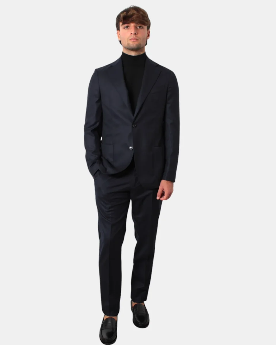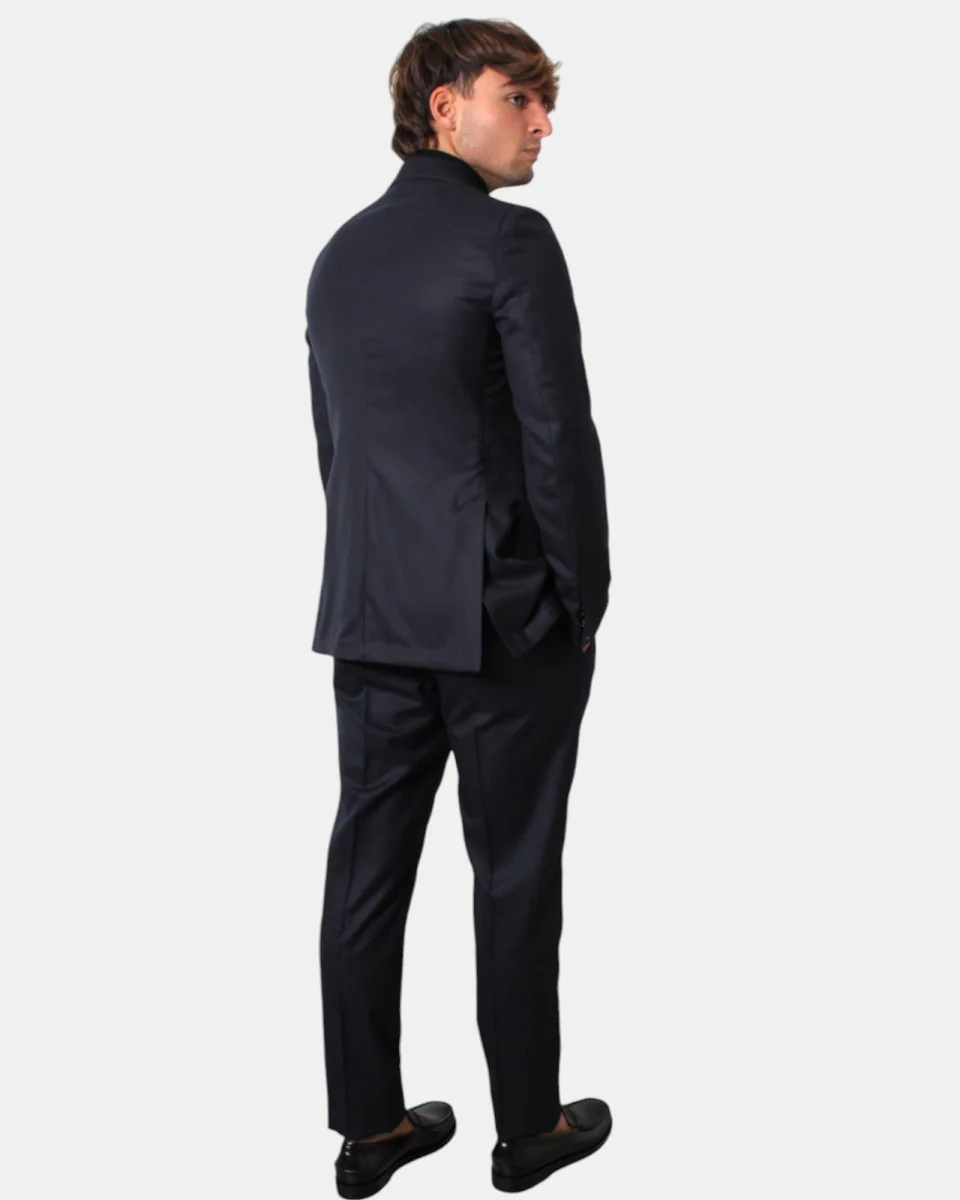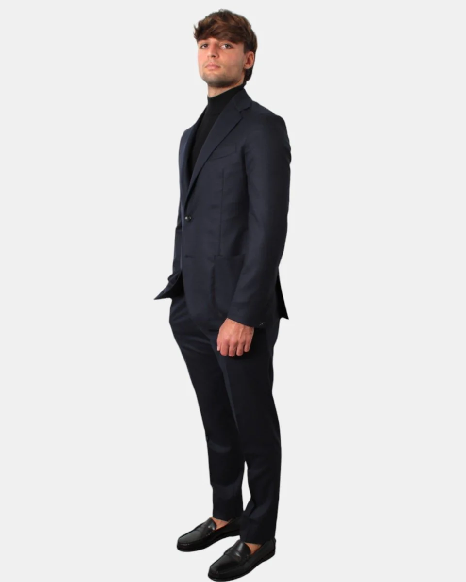 L’abito monopetto con rever classico di Galà presenta chiusura a due bottoni, con tasche a toppe, due spacchi laterali. Il pantalone presenta due tasche america e due tasche posteriori a filetto con due bottoni. Il modello è alto 179 cm e indossa una taglia 48. Il tessuto esterno dell’abito e di Vitale Barberis Canonico ed è composto per il 100% da lana vergine, la fodera è per il 100% viscosa. Si consiglia lavaggio a secco.
