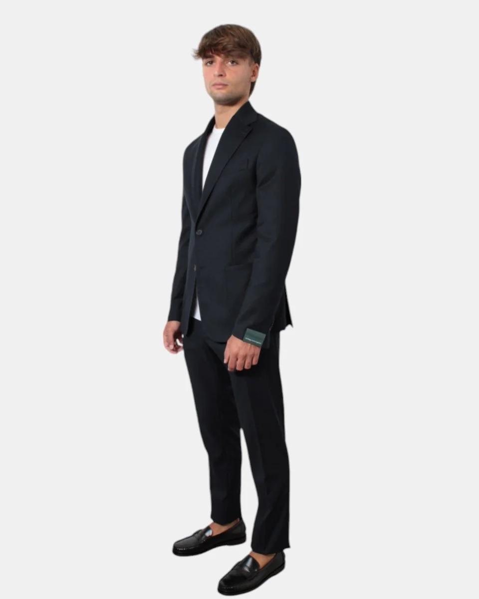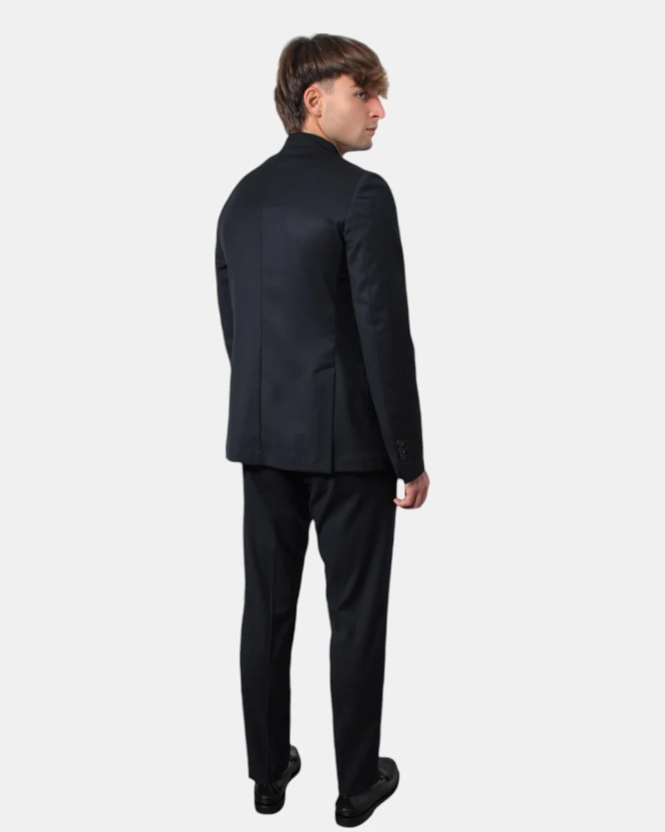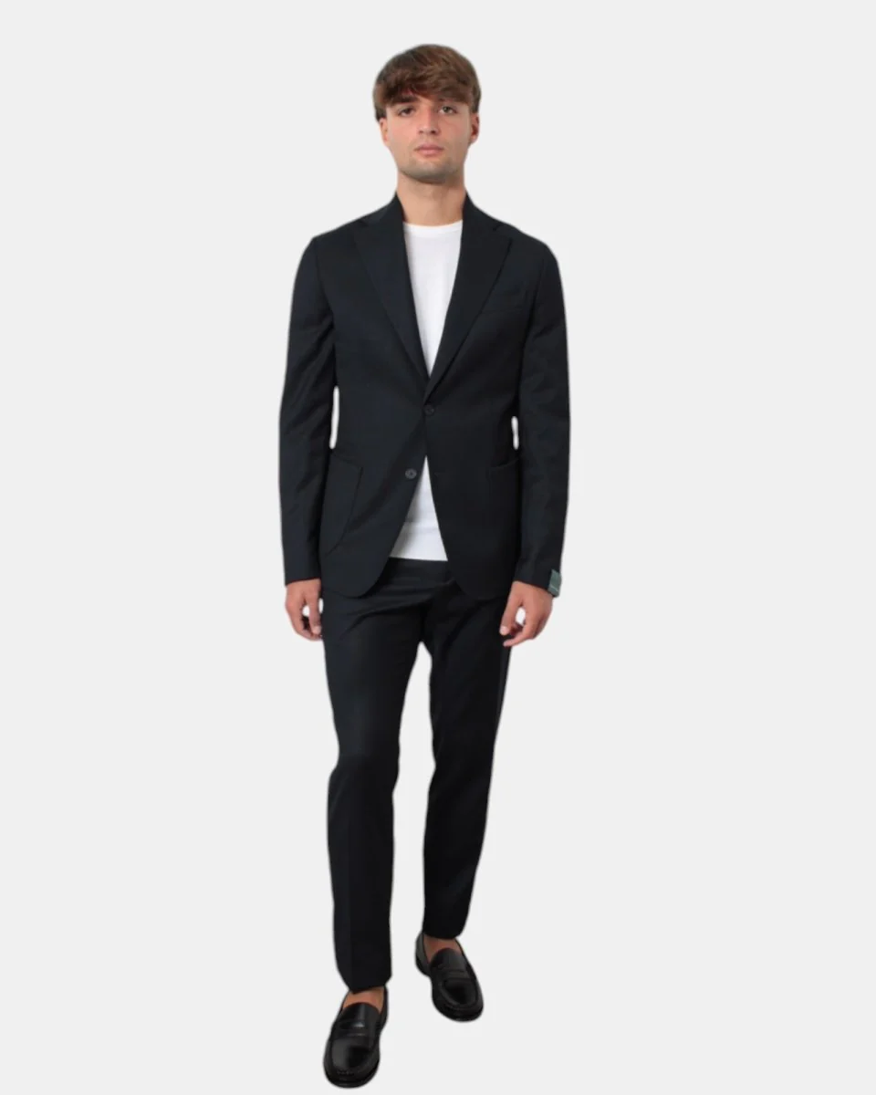 L’abito monopetto con rever classico di Bottega Marchigiana presenta chiusura a due bottoni, con tasche a toppe, due spacchi laterali. Il pantalone presenta due tasche america e due tasche posteriori a filetto. Il modello è alto 179 cm e indossa una taglia 48. Il tessuto esterno dell’abito è composto per il 17% di lana, 65% di viscosa, 15% da altre fibre e 3% elastan, la fodera è per il 100% viscosa. Si consiglia lavaggio a secco