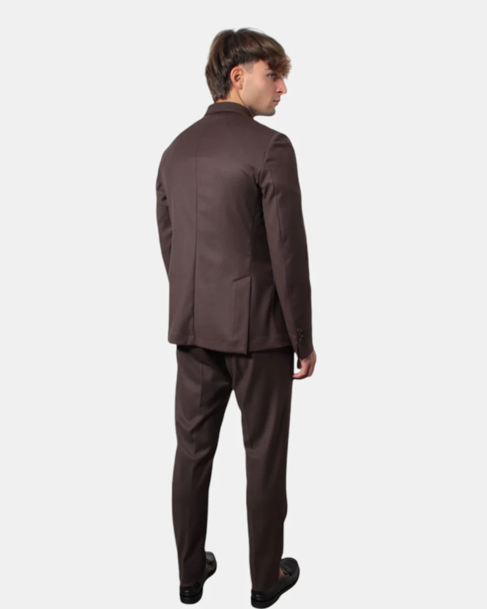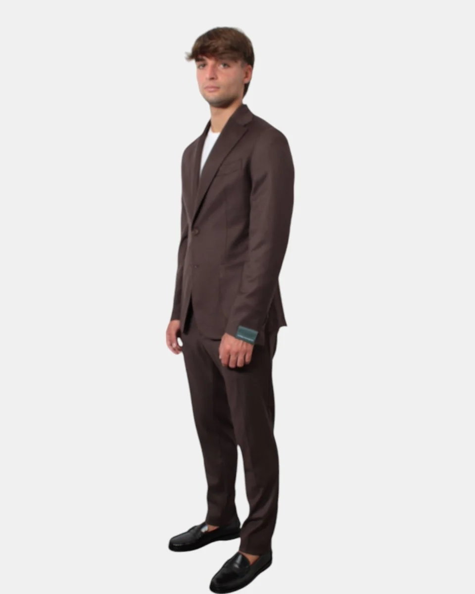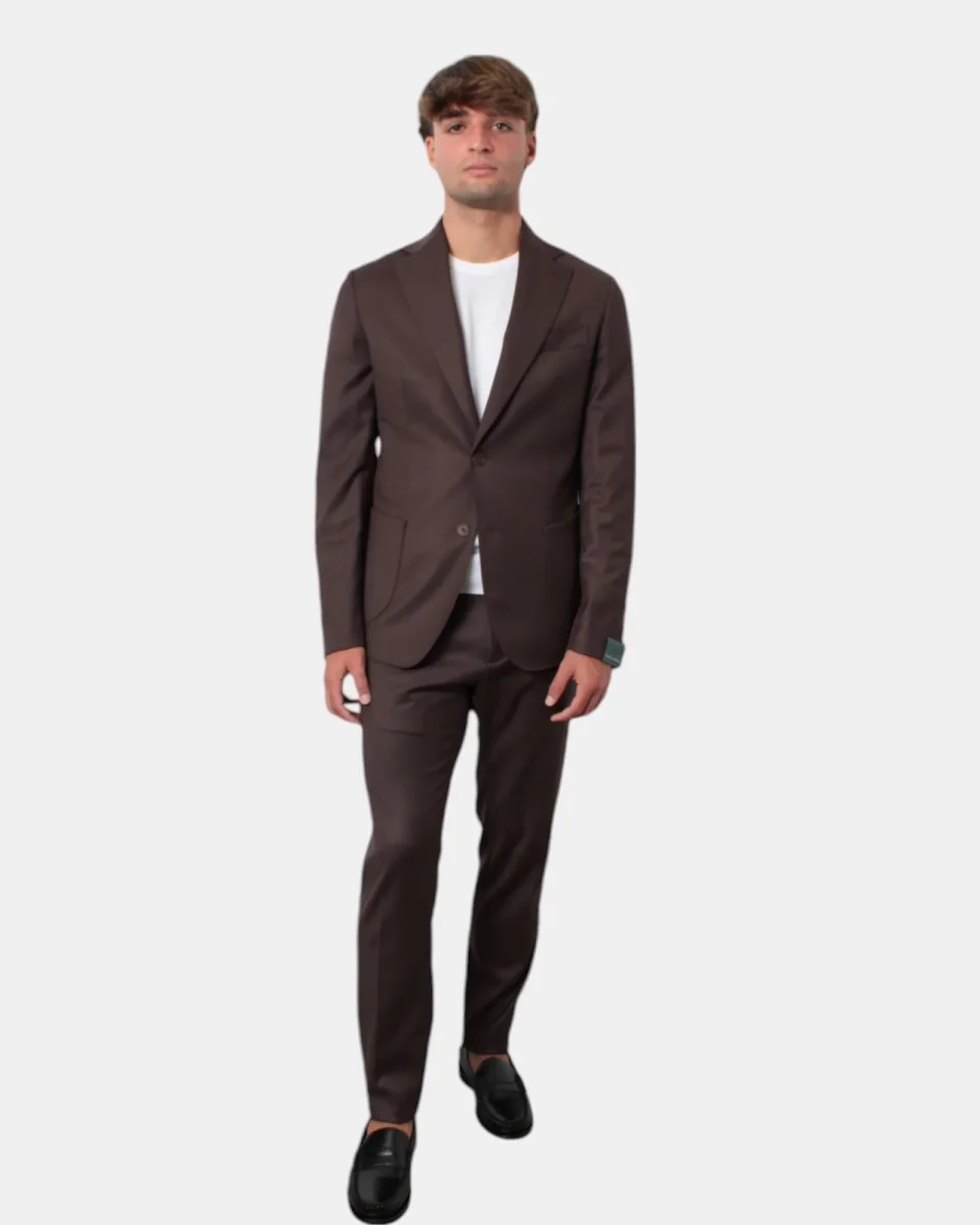 L’abito monopetto con rever classico di Bottega Marchigiana presenta chiusura a due bottoni, con tasche a toppe, due spacchi laterali. Il pantalone presenta due tasche america e due tasche posteriori a filetto. Il modello è alto 179 cm e indossa una taglia 48. Il tessuto esterno dell’abito è composto per il 17% di lana, 65% di viscosa, 15% da altre fibre e 3% elastan, la fodera è per il 100% viscosa. Si consiglia lavaggio a secco
