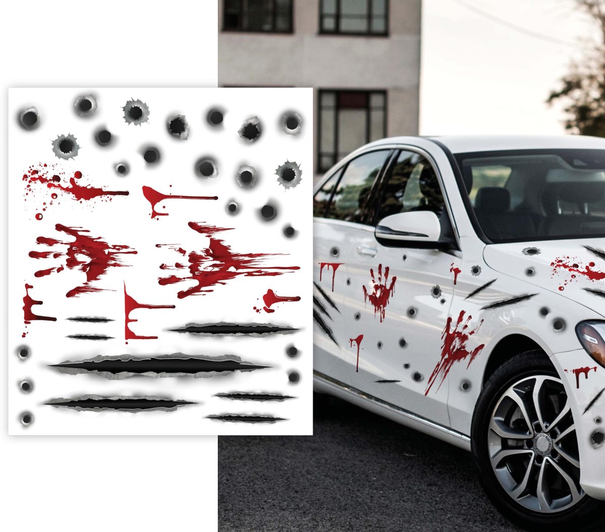 - TRASFORMA LA TUA AUTO IN UN OPERO DI TERRORE! – Include adesivi per creare un effetto agghiacciante. Non include l’auto o altri elementi decorativi. Ideale per sorprendere ad Halloween!