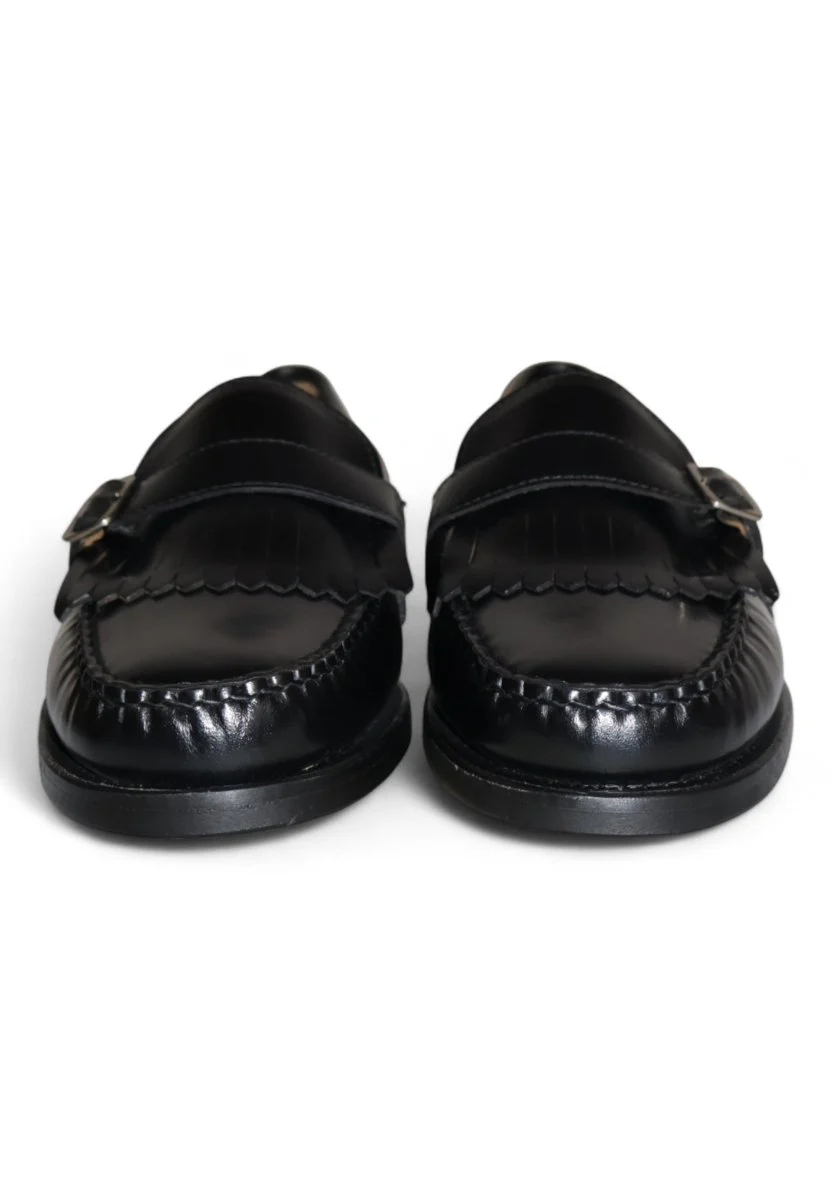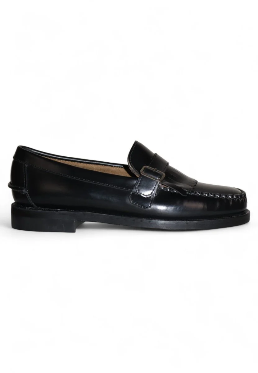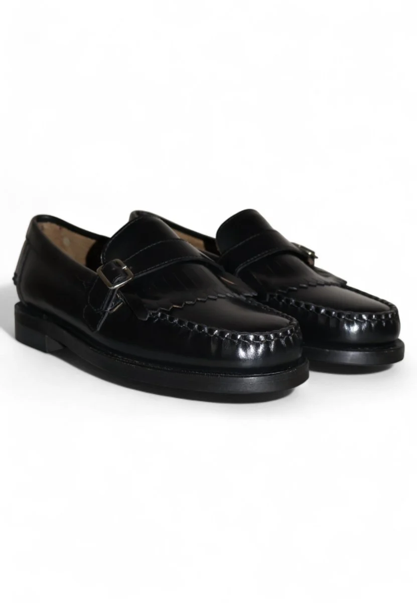Realizzato in pelle pieno fiore spazzolata, questo modello si distingue per la tomaia cucita a mano, il cinturino sottile e il dettaglio con frange, che dona al design un’identità chic, decisa e moderna. Il tacco in gomma sagomata assicura comfort e stabilità, mentre la suola in cuoio trattato, con inserto in gomma, garantisce maggiore flessibilità, durata e resistenza all’acqua.