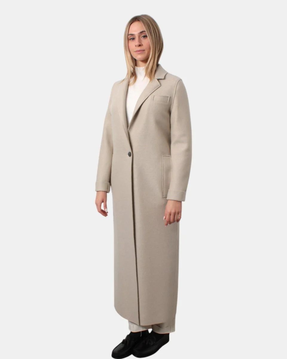 Il cappotto lungo di ”ANNIEPARIS” presenta monopetto un bottone, due tasche a filo laterali con pattina e un taschino sul petto, presenta vestibilità slim, caratterizzato da un tessuto corposo e caldo dovuto alla sua composizione in 100% lana vergine. Si consiglia lavaggio a secco. La modella è alta 1,70 m e indossa una 40