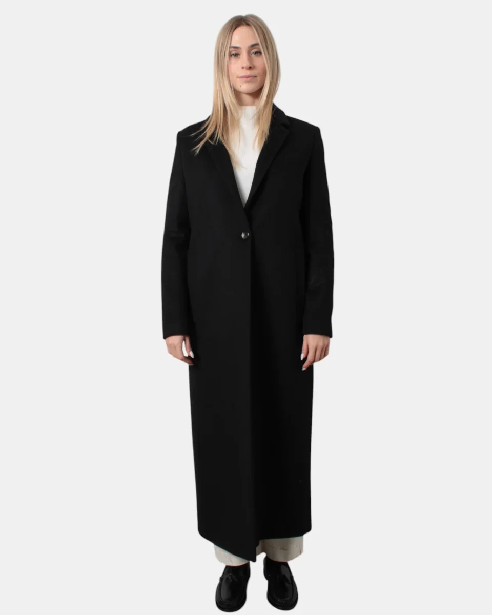 Il cappotto lungo di ”ANNIEPARIS” presenta monopetto un bottone, due tasche a filo laterali con pattina e un taschino sul petto, presenta vestibilità slim, caratterizzato da un tessuto corposo e caldo dovuto alla sua composizione in 70% lana vergine, 20 poliamide e 10% cashmere . Si consiglia lavaggio a secco. La modella è alta 1,70 m e indossa una 40