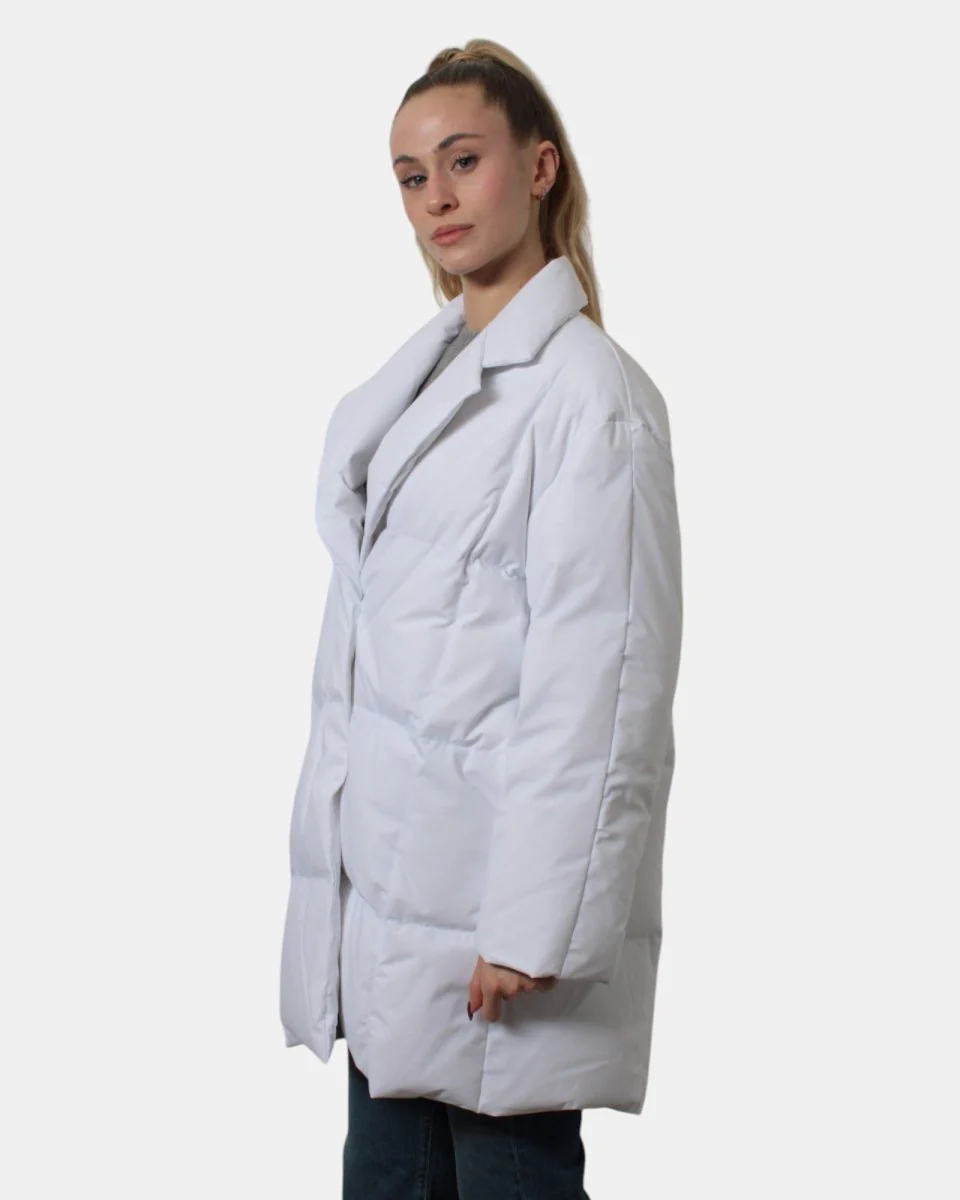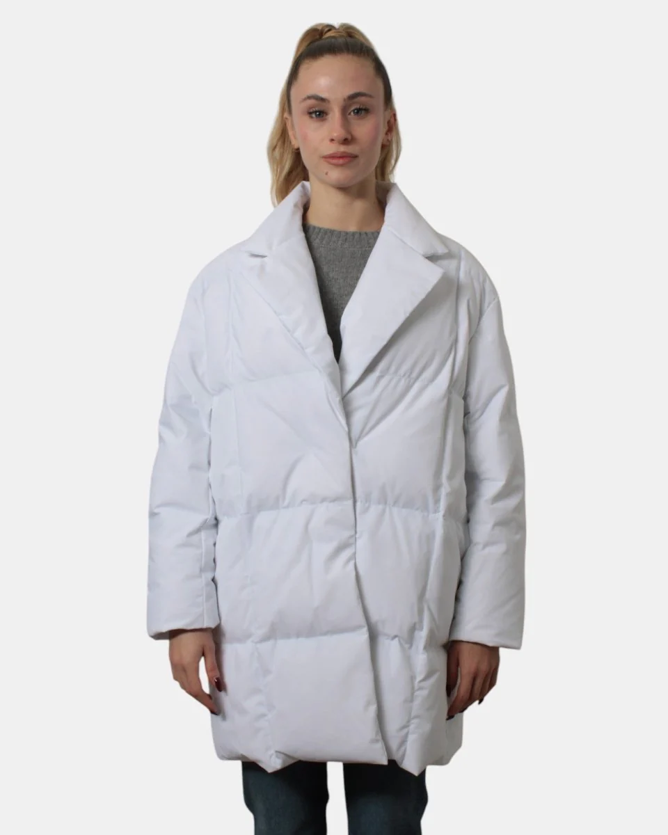 Il piumino di Annieparis presenta chiusura a due bottoni con magnete, collo monopetto, dalla mano soffice calda dovuta alla sua composizione in 71% poliammide e 29% poliestere. La modella è alta 1,67 m e indossa una M