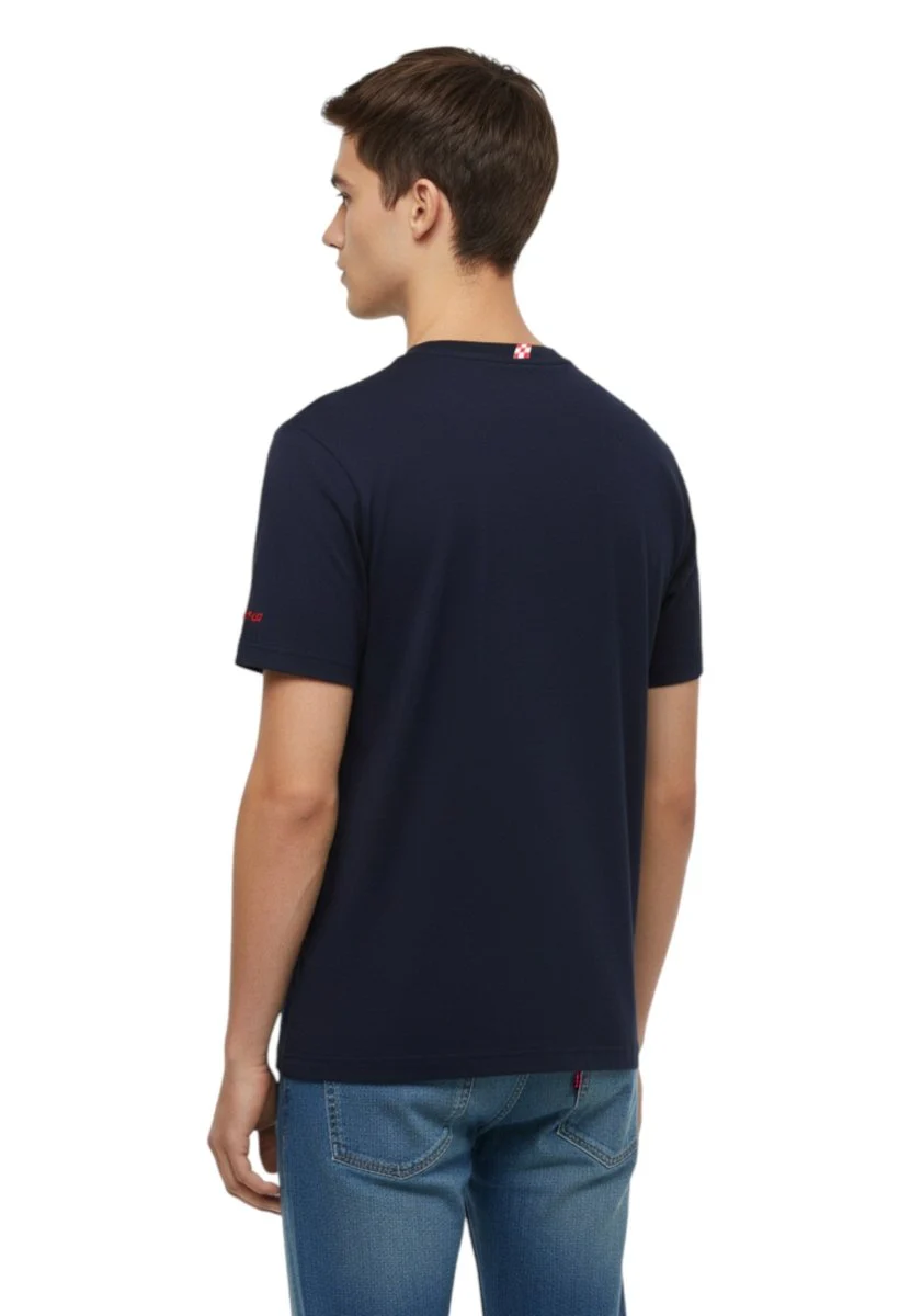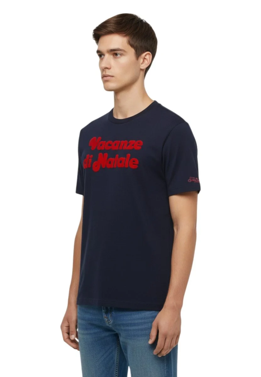 Il design in blu navy tinta unita viene impreziosito da ricami accurati e una stampa flock esclusiva: sulla manica, il classico ricamo “St. Barth” e vacanze di Natale; sul petto, la locandina del celebre film “Vacanze di Natale” stampata in flock, che aggiunge un tocco vintage-pop dal forte impatto visivo.