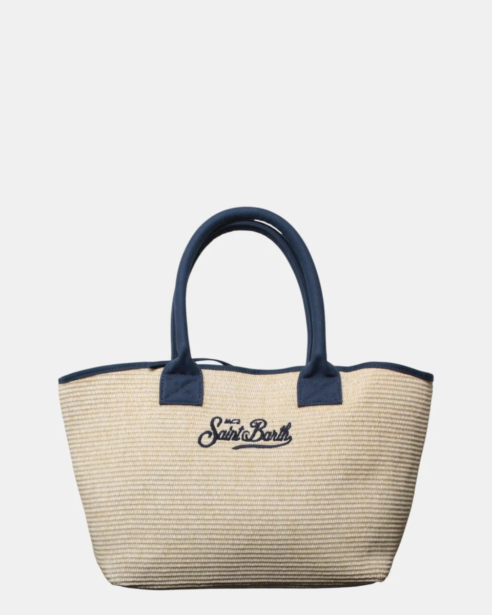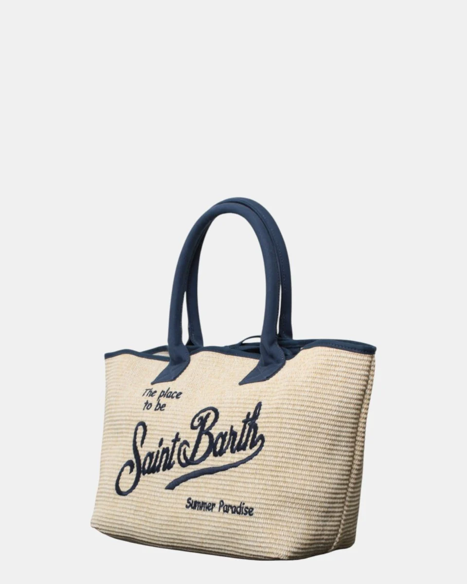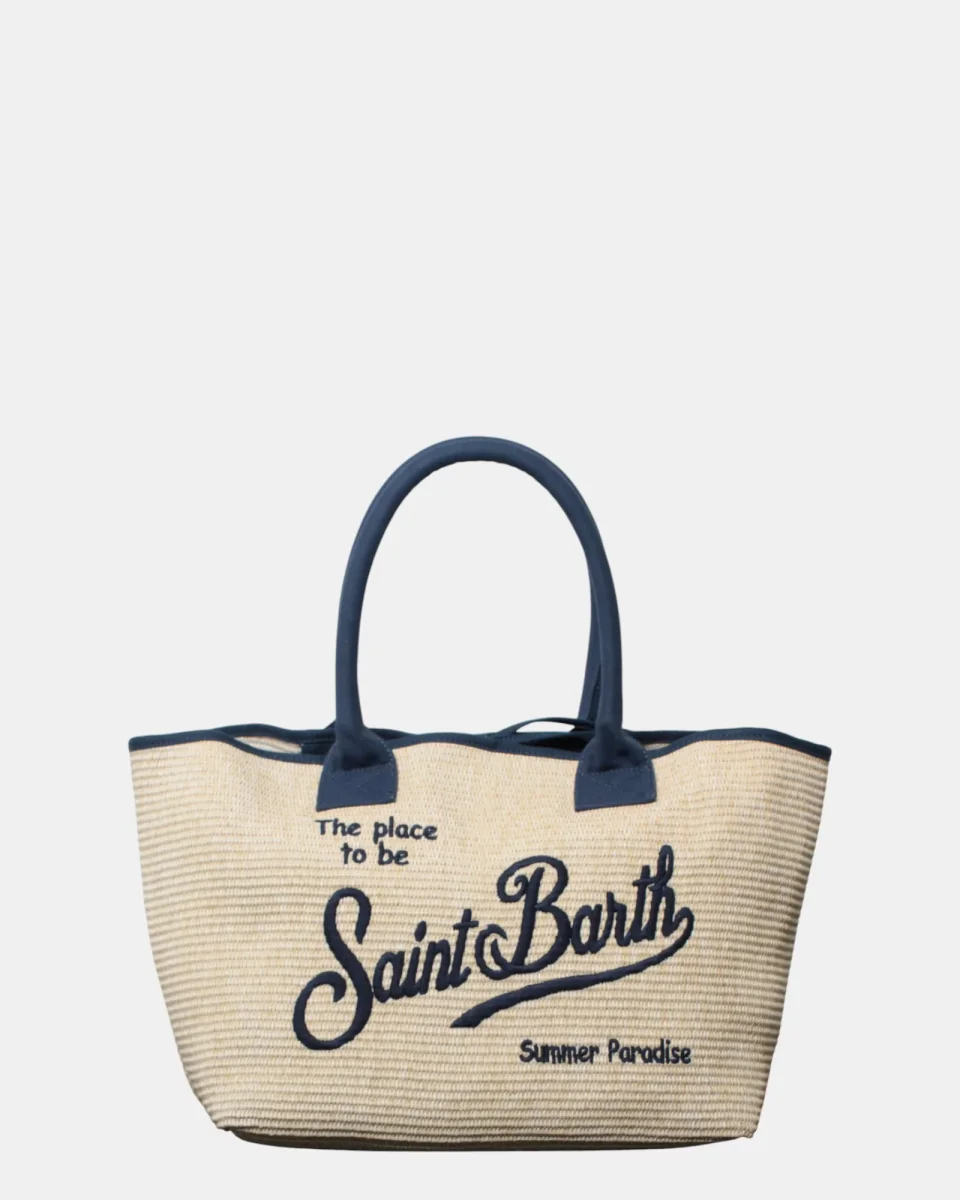 – DETTAGLI: Ricamo Saint Barth blu frontale, Manici in cotone e tasca interna con chiusura zip
