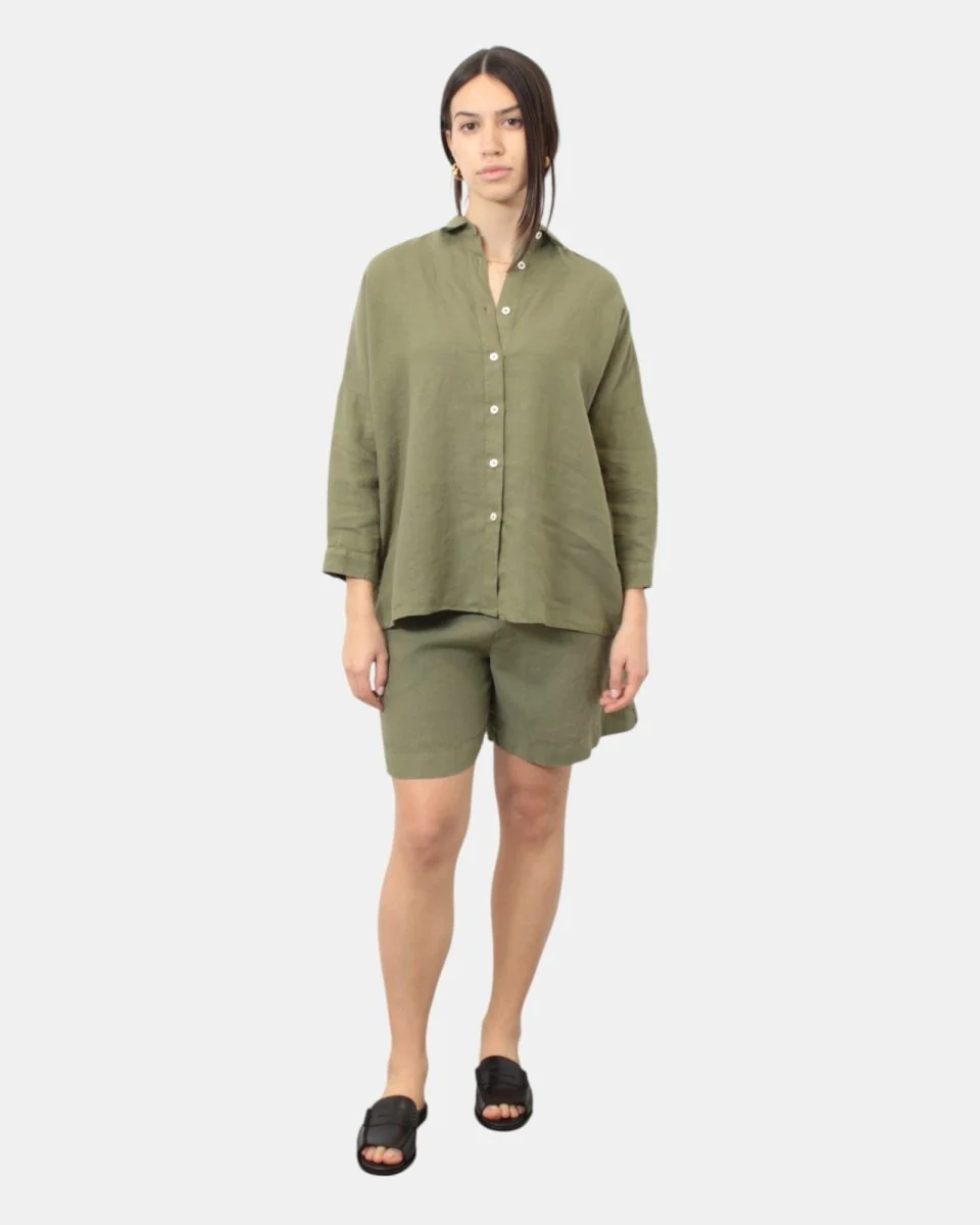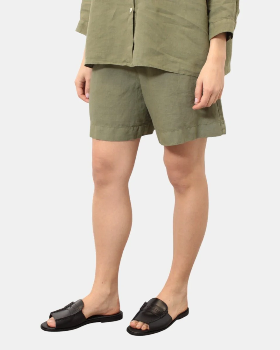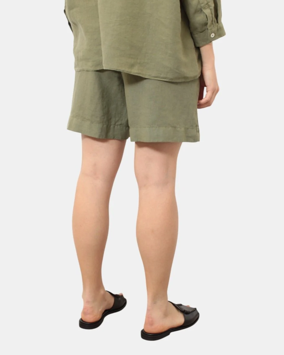 Il bermuda di Academia presenta elastico in vita, due tasche, dalla mano fresca dovuta alla sua composizione in 100% lino. Si consiglia lavaggio a mano. La modella è alta 1,68 m e indossa una S