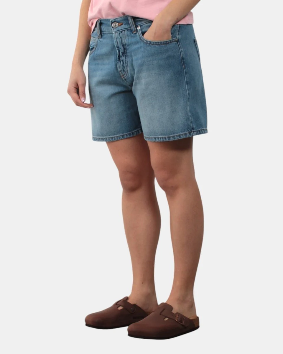 il bermuda a jeans di Roy Roger’s presenta chiusura a bottoni, tasche frontali e sul retro. Dalla mano fresca dovuta alla sua composizione in 70% cotone e 30% lyocell. La modella è alta 1,68 m e indossa una 27
