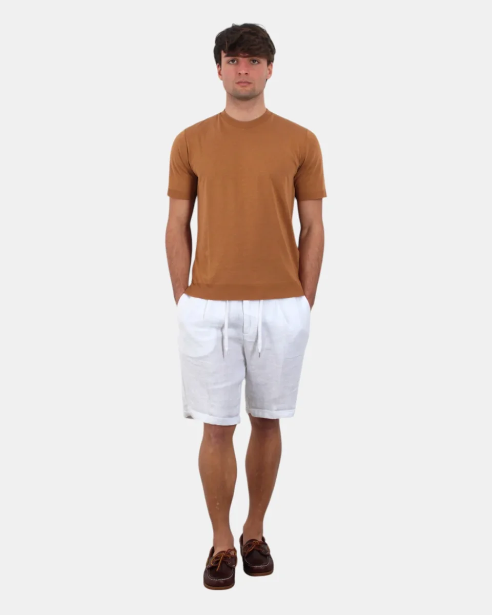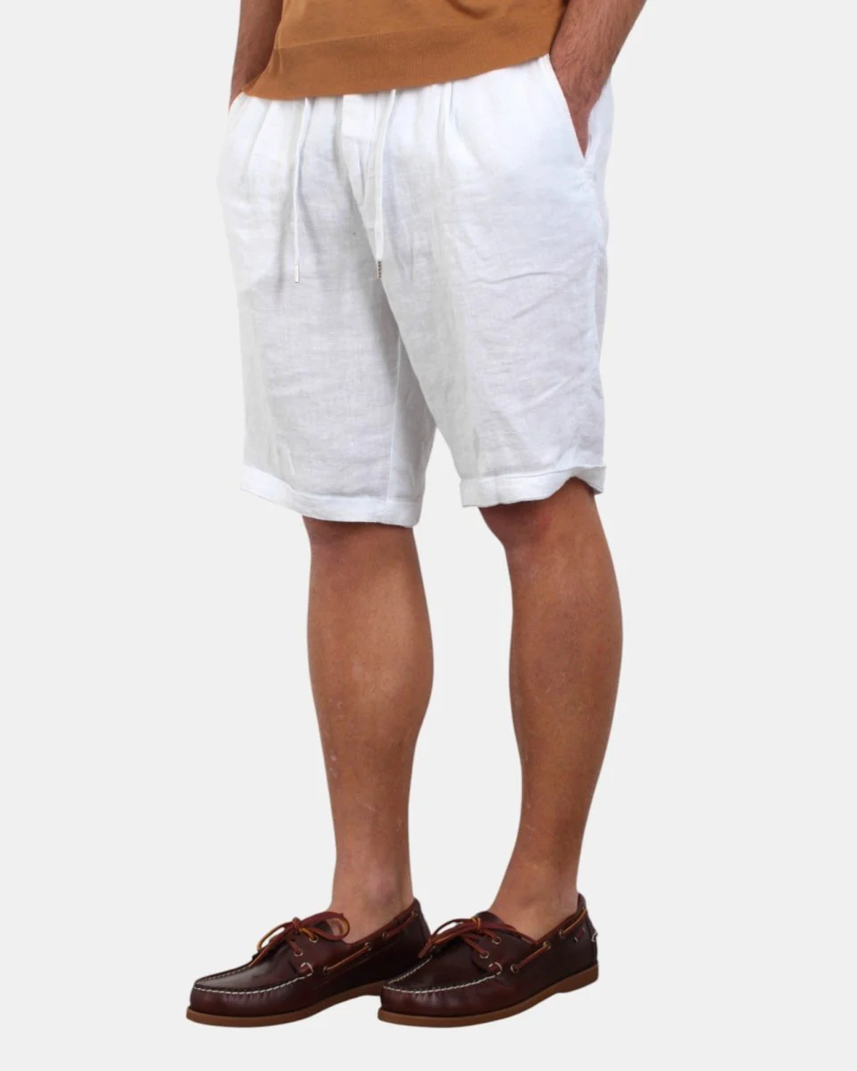 Il bermuda di 40 Weft presenta elastico con chiusura, chiusura con zip e bottone, due tasche frontali, due sul retro dalla mano fresca dovuta alla sua composizione in 100% lino. Si consiglia lavaggio a massimo 30 gradi. Il modello è alto 1,78 e indossa una 48
