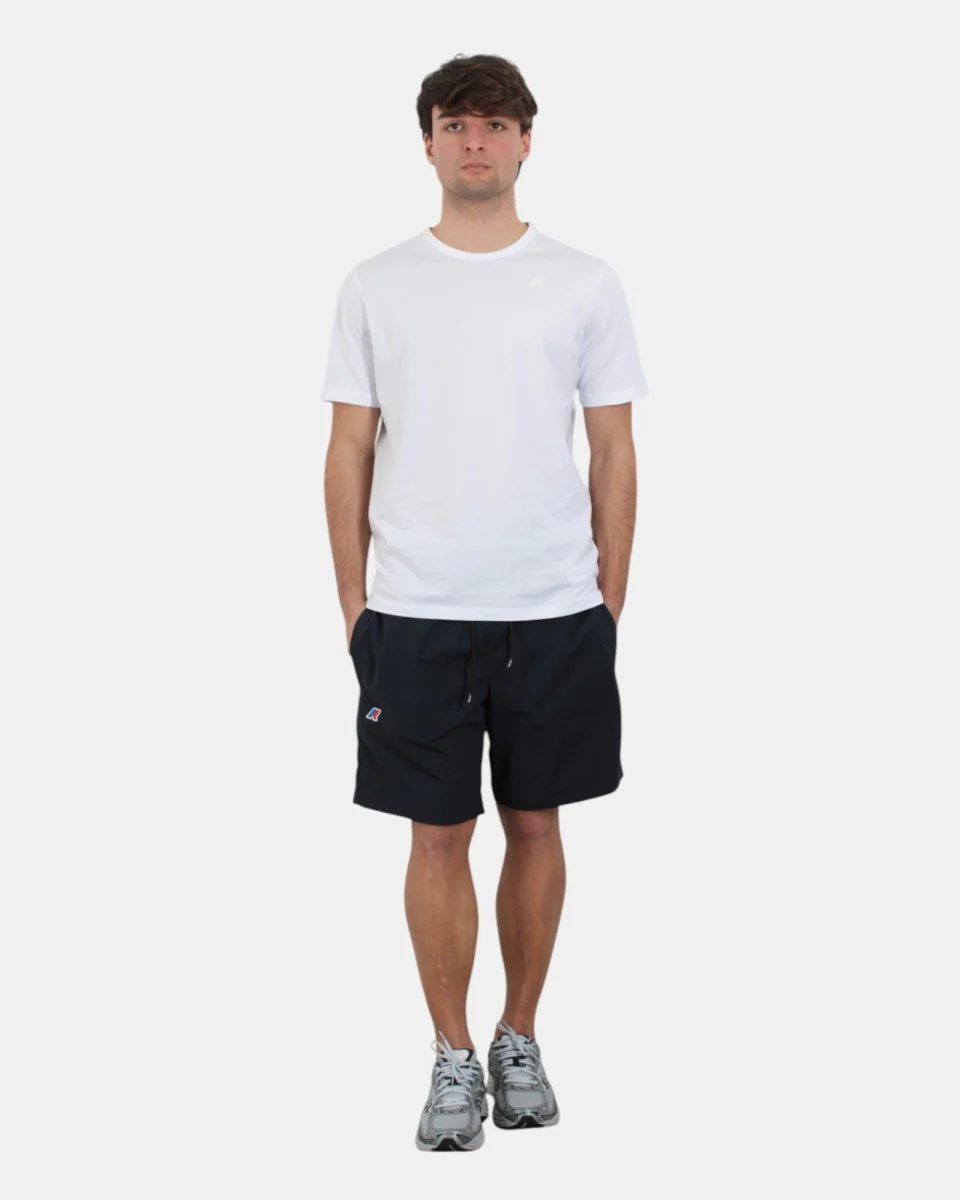 Il bermuda di K-Way presenta elastico con coulisse, due tasche frontali, logo brand, dalla mano fresca dovuta alla sua composizione in 85% poliammide e 15% elastan. Si consiglia lavaggio a massimo 30 gradi. Il modello è alto 1,78 m e indossa una L