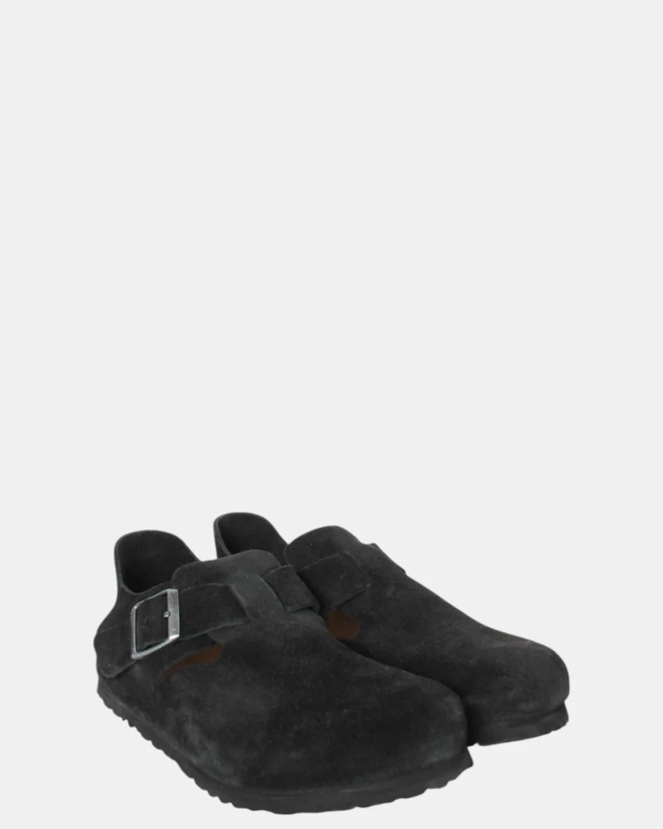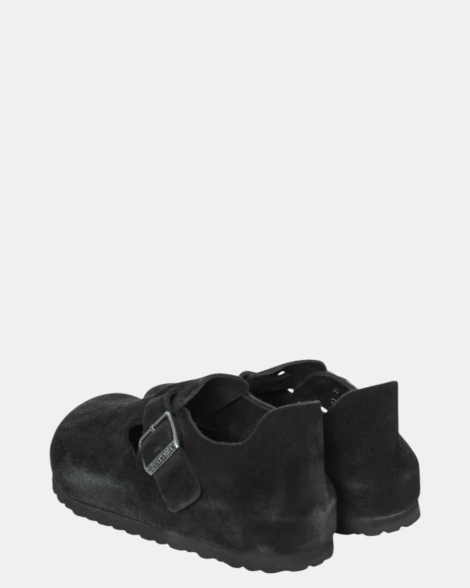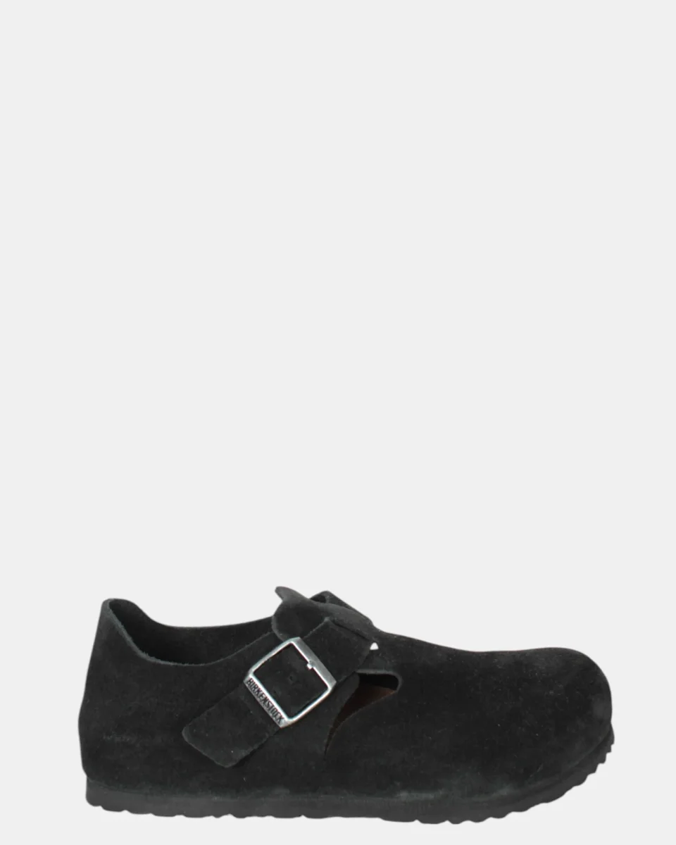 La scarpa di Birkenstock modello london, presenta chiusura sul tallone, esternamente scamosciata , chiusura con cinturino sul collo del piede, calzata regolare.