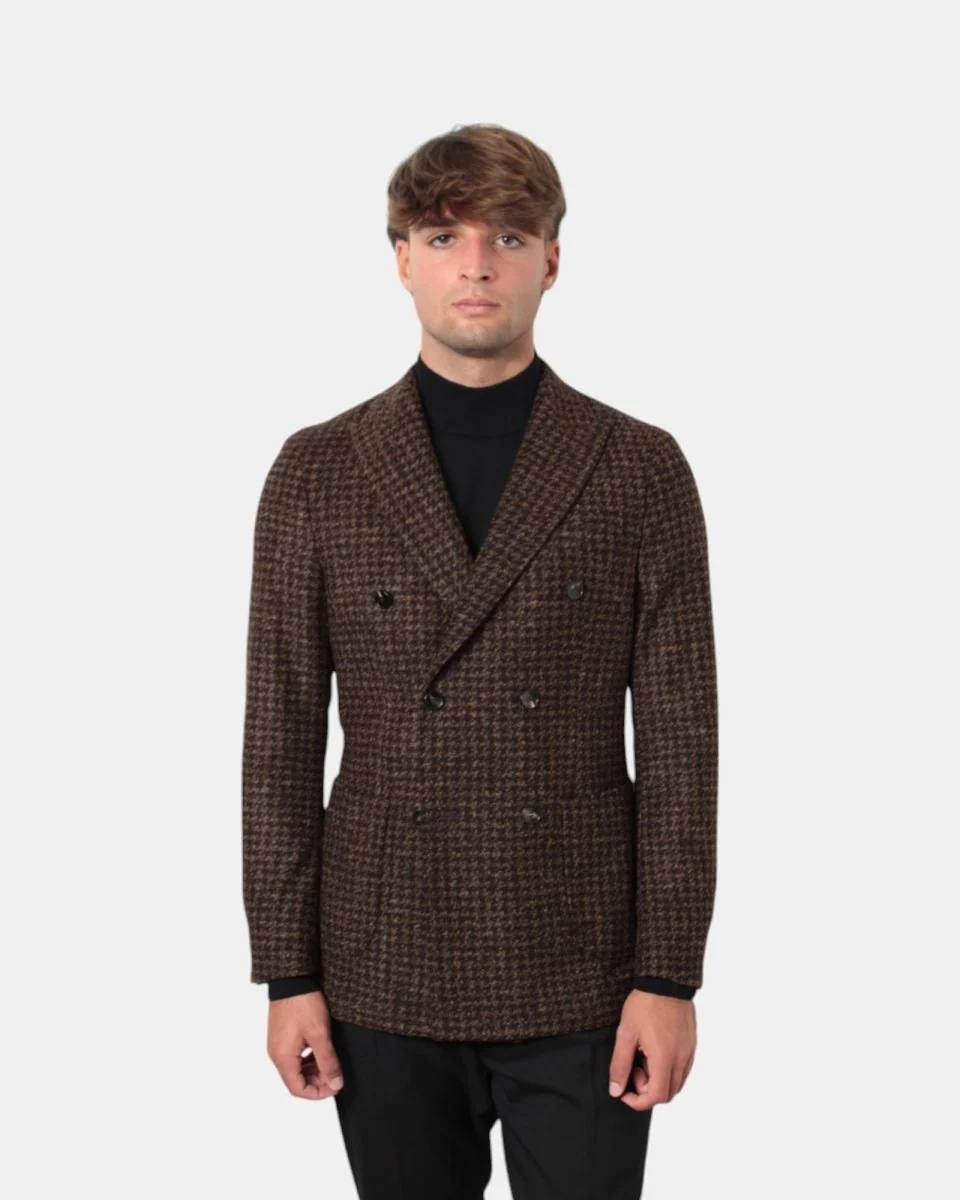 La giacca pied pull in lana doppio petto con rever a lancia di Breras Milano presenta chiusura a sei bottoni, con tasche a toppa, due spacchi laterali. Il modello è alto 179 cm e indossa una taglia 48. Il tessuto esterno della giacca è per il 54% acrilica, per il 24% composta da lana vergine, per il 22% da poliestere , la fodera è composta per il 60% in acetato e per il 40% in poliestere. Si consiglia lavaggio a secco