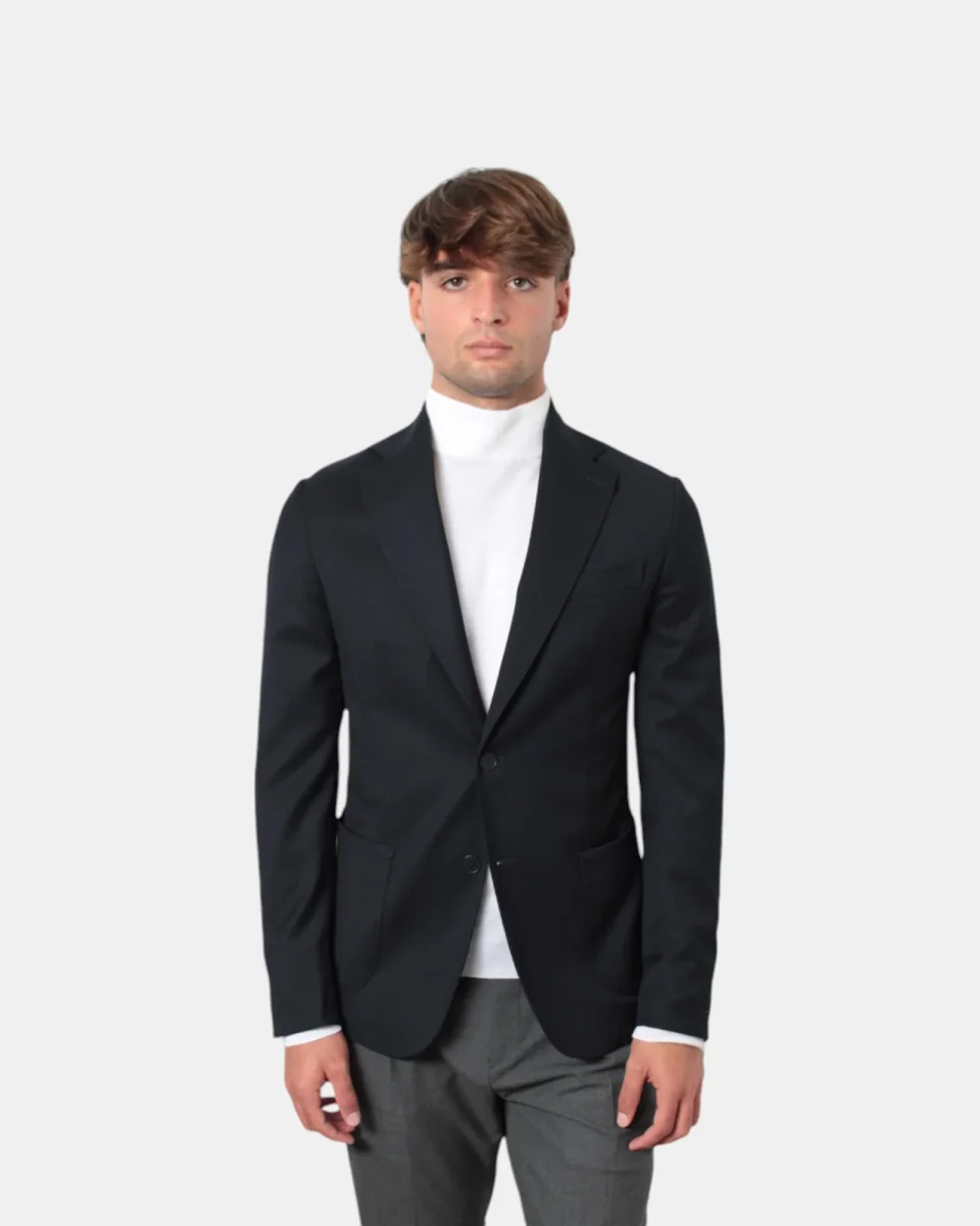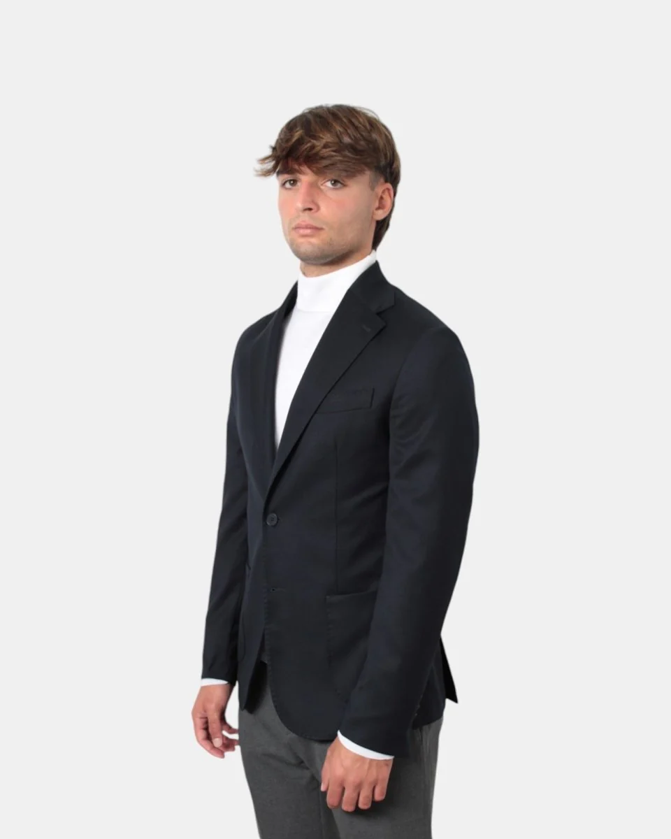La giacca con rever classico di Bottega Marchigiana presenta chiusura a due bottoni, con tasche a toppa, due spacchi laterali. Il modello è alto 179 cm e indossa una taglia 46. Il tessuto esterno della giacca è composto per il 17% da lana, 65% viscosa, per il 15% da altre fibre,3% elastan, la fodera è 100% viscosa. Si consiglia lavaggio a secco