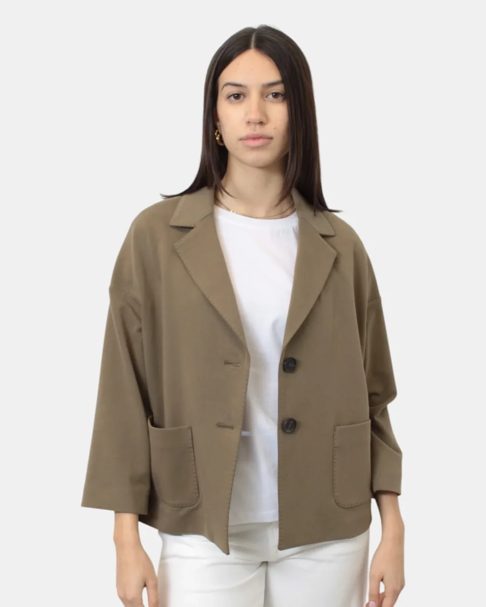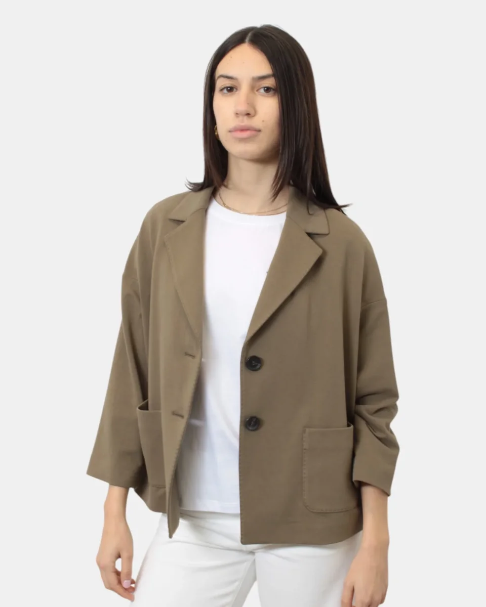 La giacca di circolo presenta chiusura a due bottoni, giro sceso, due tasche a toppa, dalla mano fresca dovuta alla sua composizione in 93% cotone e 7% lycra. La modella è alta 1,68 m e indossa una 40