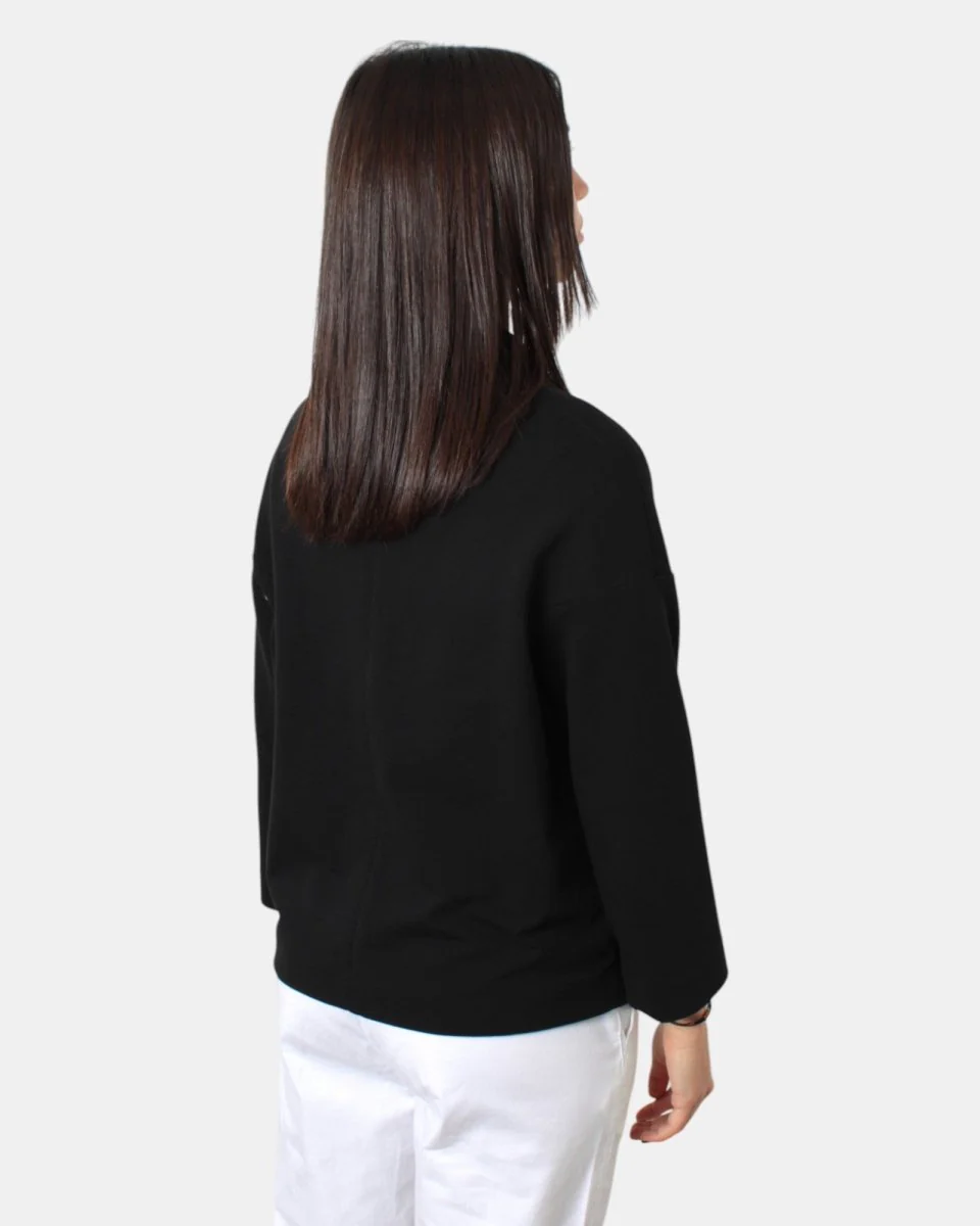 La giacca di circolo presenta chiusura a due bottoni, giro sceso, due tasche a toppa, dalla mano fresca dovuta alla sua composizione in 93% cotone e 7% lycra. La modella è alta 1,68 m e indossa una 40