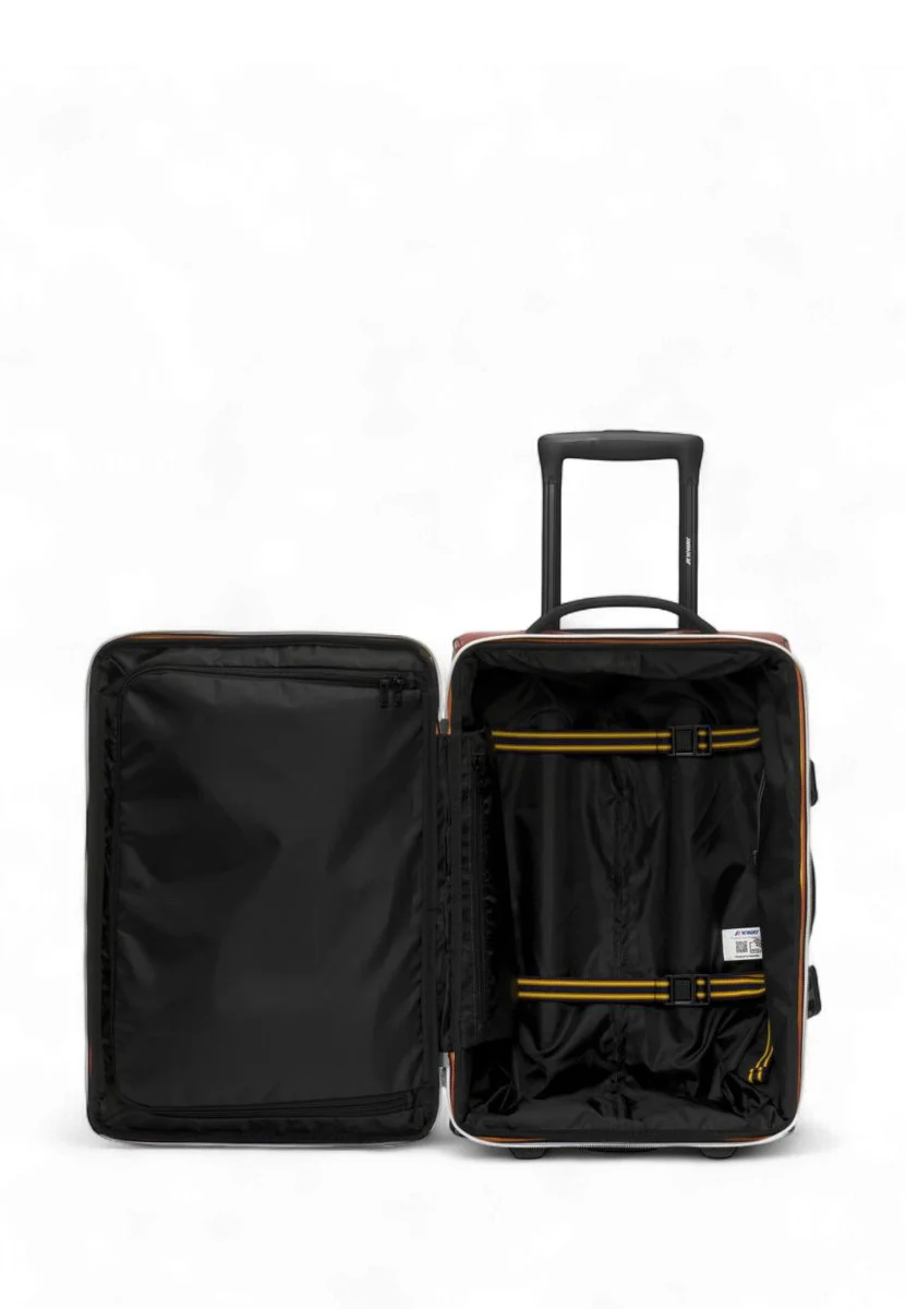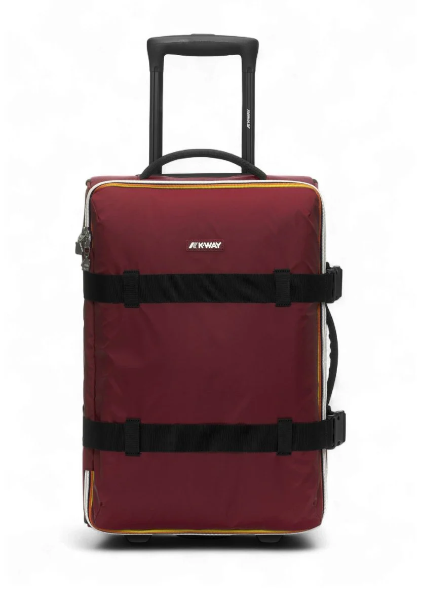 Realizzato in nylon ripstop impermeabile, idrorepellente e antivento, è dotato di base rinforzata per garantire resistenza agli urti e all’usura. Le due ruote posteriori, insieme al manico rigido estraibile, alle maniglie laterale e superiore e alla chiusura con zip K-Way a doppio cursore, offrono un’esperienza di trasporto comoda e versatile.