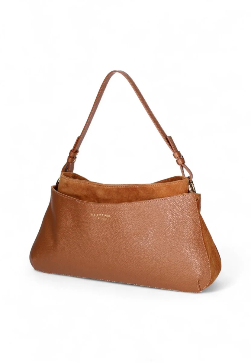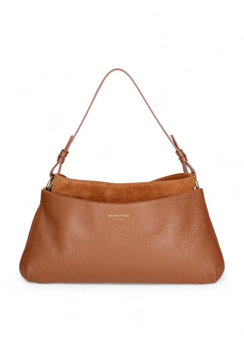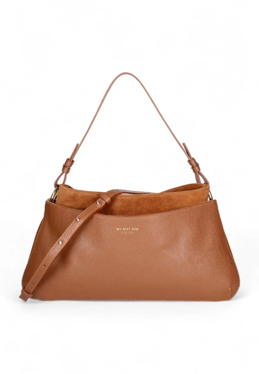 Un mix perfetto di stile e raffinatezza: la borsa trapezio My Best Bag è realizzata in pelle e camoscio, combinando materiali di alta qualità per un effetto sofisticato e moderno.