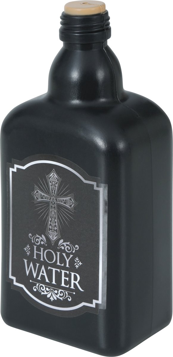 Una bottiglia di acqua benedetta realizzata in plastica di qualità. La bottiglia è vuota e non può essere riempita, in quanto il tappo è un tutt’uno con la bottiglia e non si può togliere. Perfetta come accessorio ad Halloween per travestirsi da prete esorcista o prete zombie. La bottiglia ha un’altezza di cm 18. La plastica è di colore nero ed è presente un’etichetta con disegnata una croce e la frase Holy Water