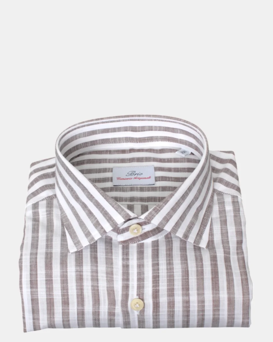 La camicia di Brio presenta fantasia a righe verticali, chiusura a sette bottoni, dalla mano fresca dovuta alla sua composizione in 50% cotone e 50% lino. Si consiglia lavaggio a massimo 30 gradi.