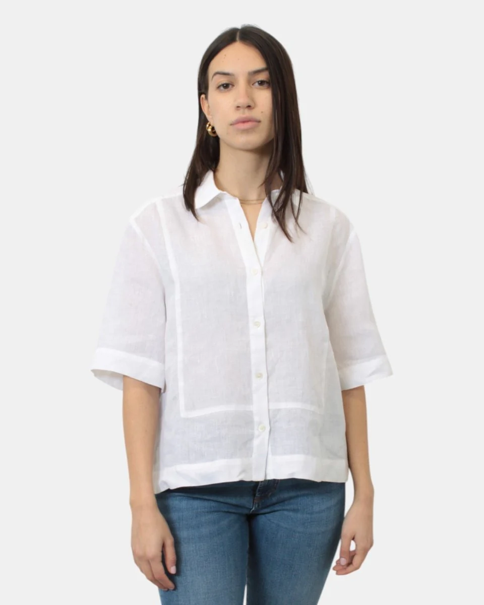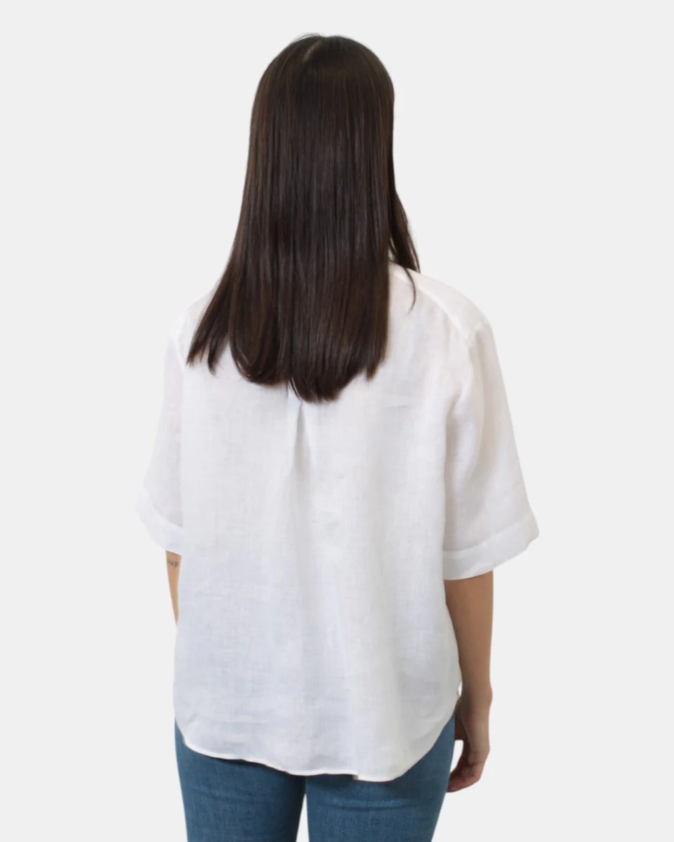 La camicia di Academia a maniche corte, presenta chiusura frontale a sei bottoni, manica raglan, dalla mano fresca dovuta alla sua composizione in 100% lino. Si consiglia lavaggio a mano. La modella è alta 1,68 m e indossa una XS