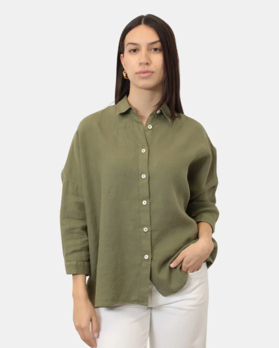 La camicia di Academia presenta chiusura frontale a sei bottoni, manica raglan, dalla mano fresca dovuta alla sua composizione in 100% lino. Si consiglia lavaggio a mano. La modella è alta 1,68 m e indossa una XS