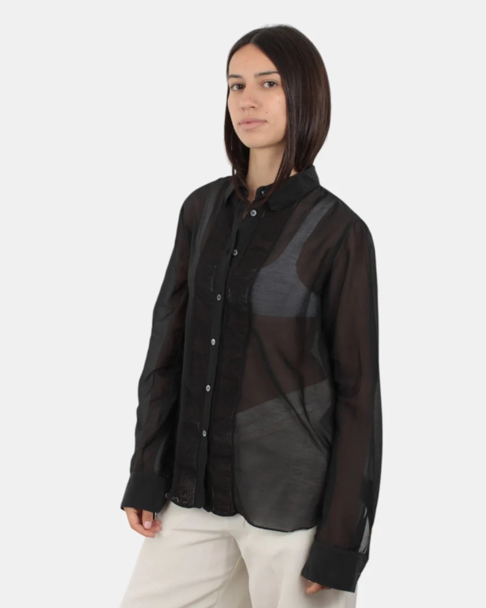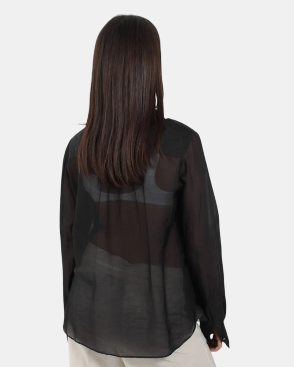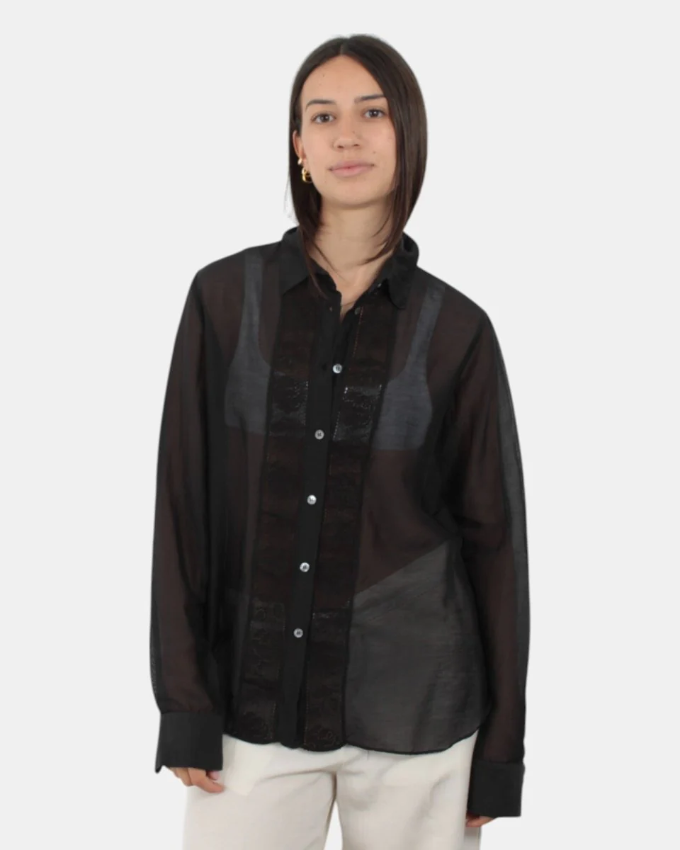 Camicia di Jucca presenta manica lunga con dettaglio in pizzo in mussola sul davanti, chiusura con bottoni. Composizione in 72% cotone e 28% seta. Si consiglia lavaggio a massimo 30 gradi. La modella è alta 1,68 m e indossa una 42.