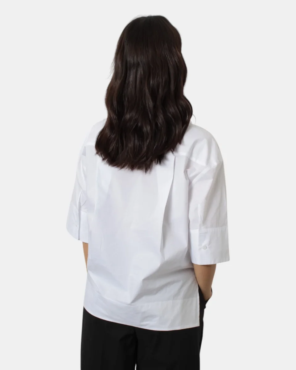 La camicia di Meimeij presenta manica raglan, chiusura a sei bottoni, w spacchetti laterali, dalla mano fresca dovuta alla sua composizione in 100% cotone, si consiglia lavaggio a mano. La modella è alta 1,68 m e indossa una 38