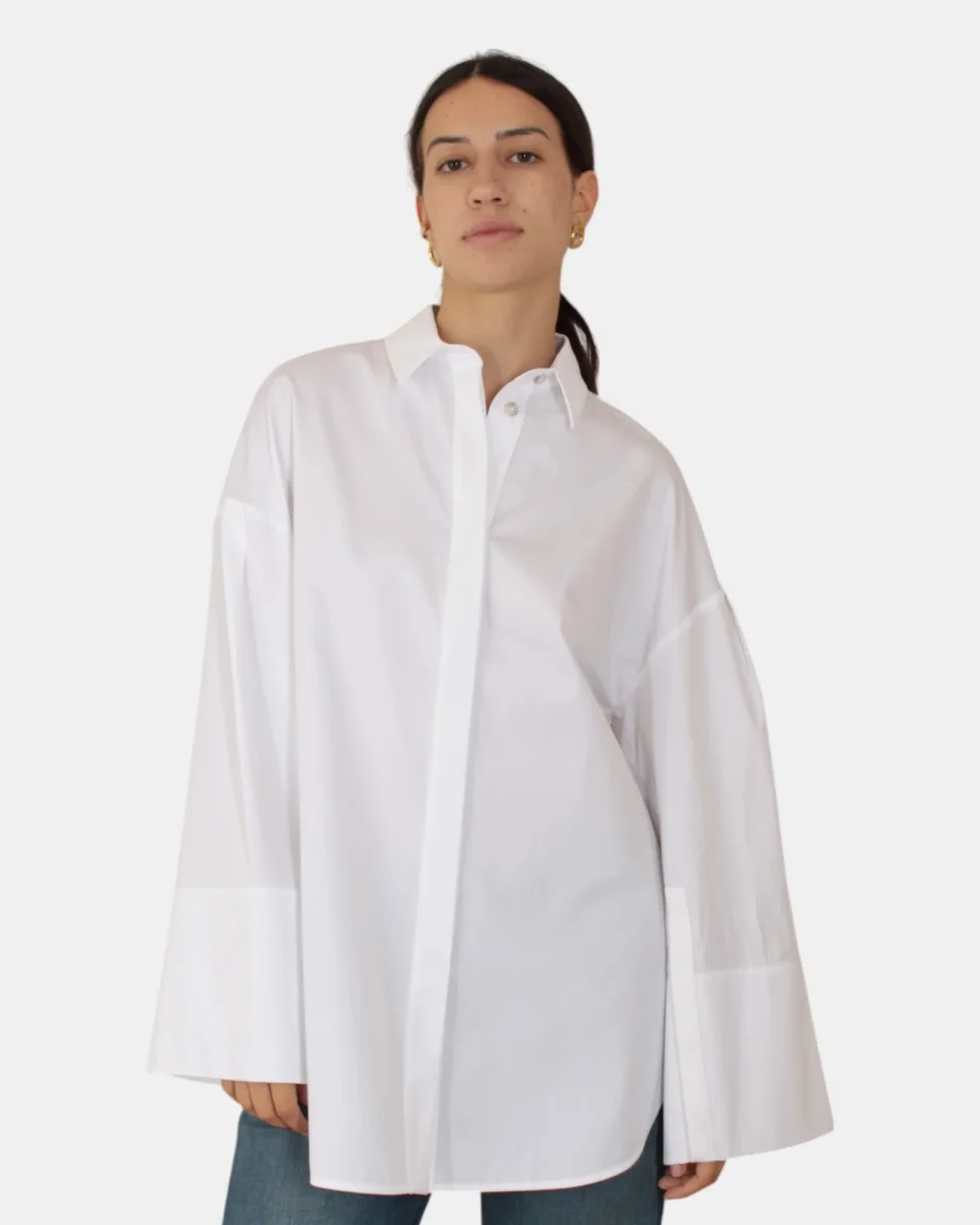 La camicia di MM MAX MARA a maniche lunga, presenta chiusura frontale a sei bottoni, manica raglan, dalla mano fresca dovuta alla sua composizione in 100% cotone. Si consiglia lavaggio a mano. La modella è alta 1,68 m e indossa una 38