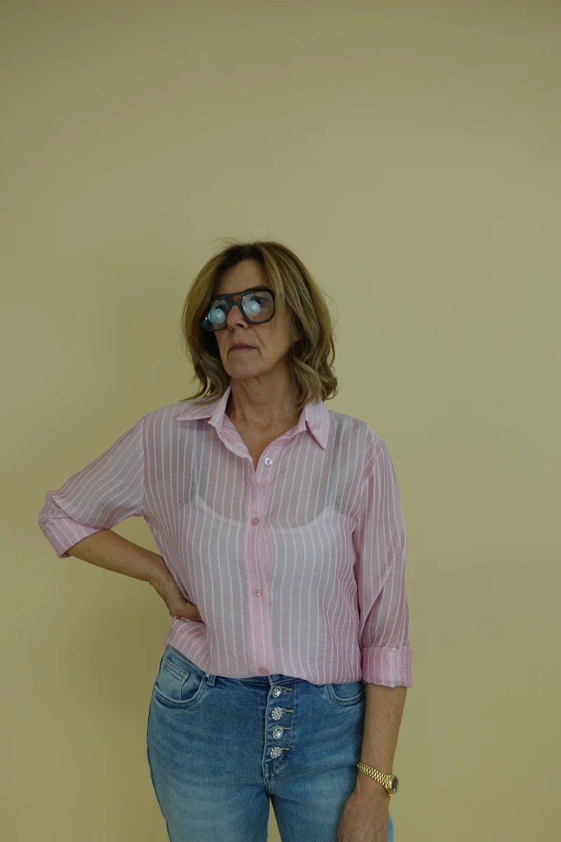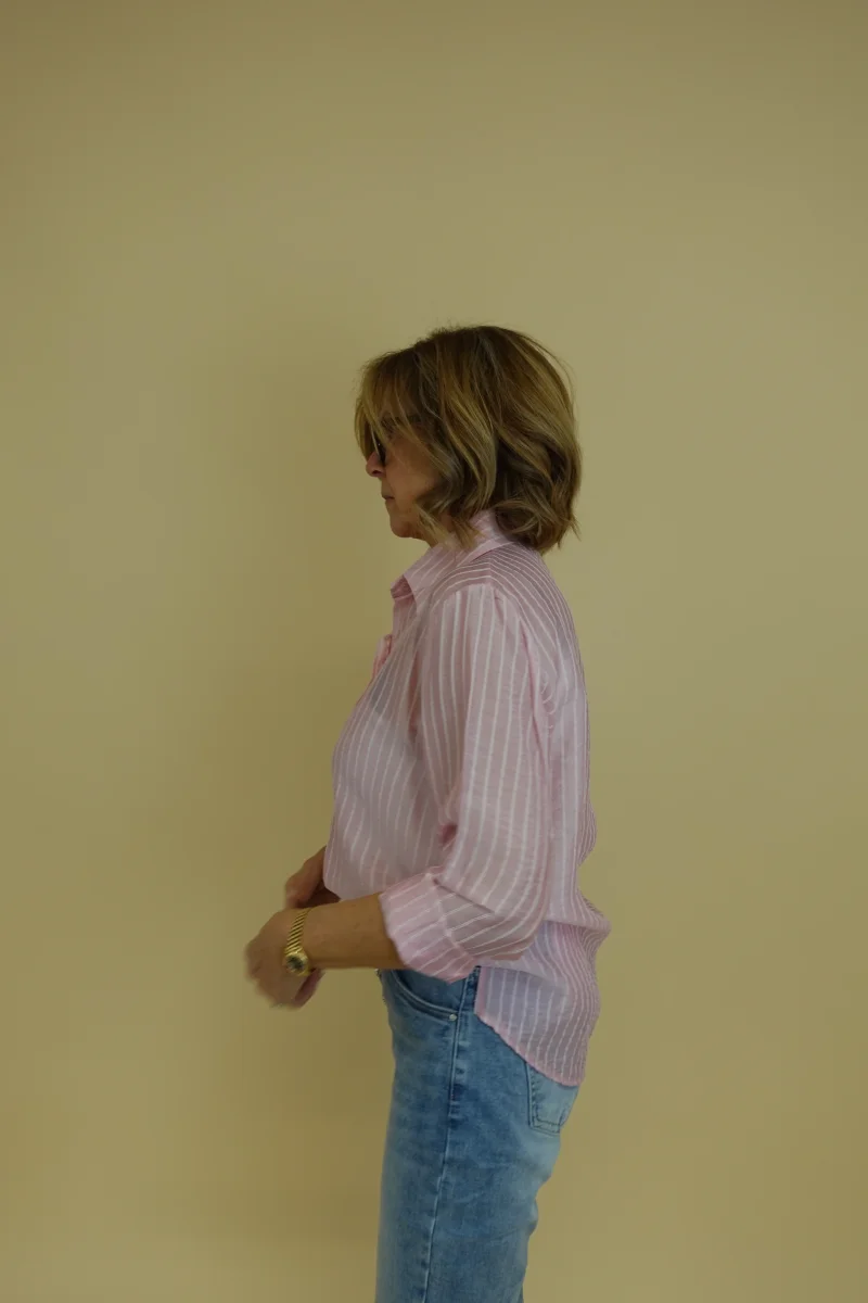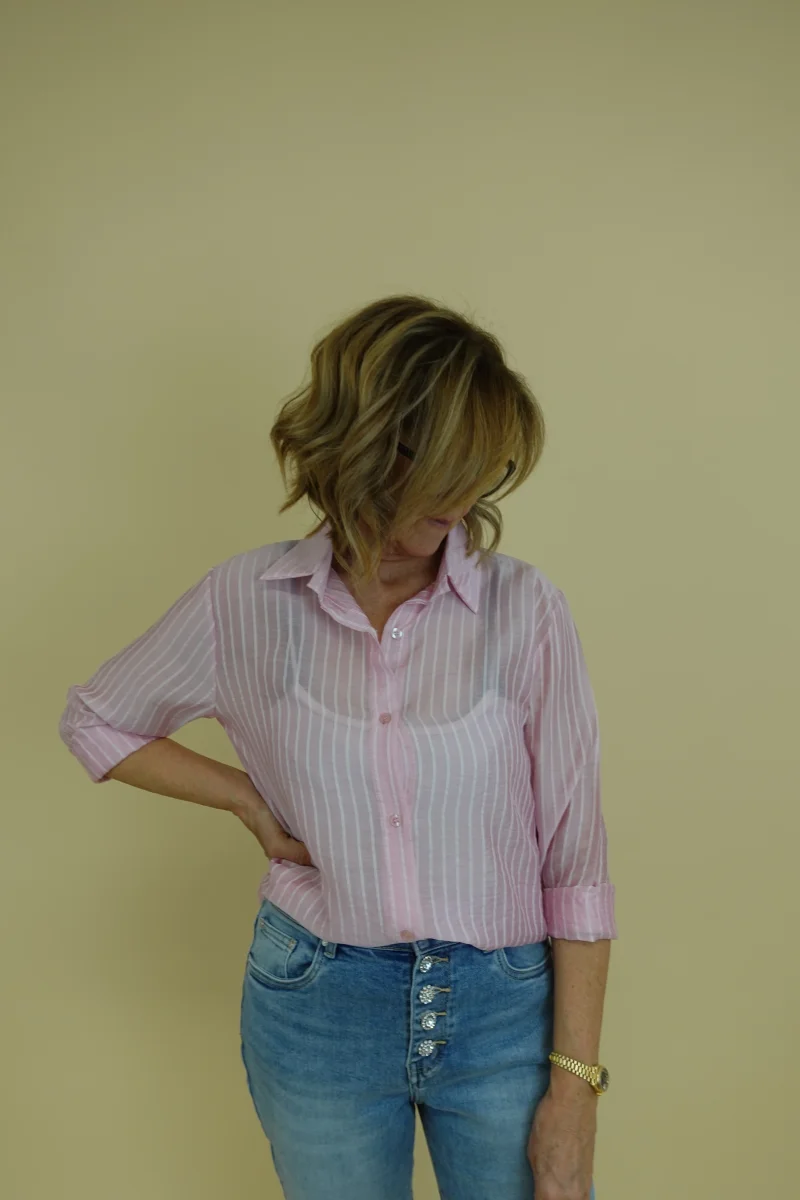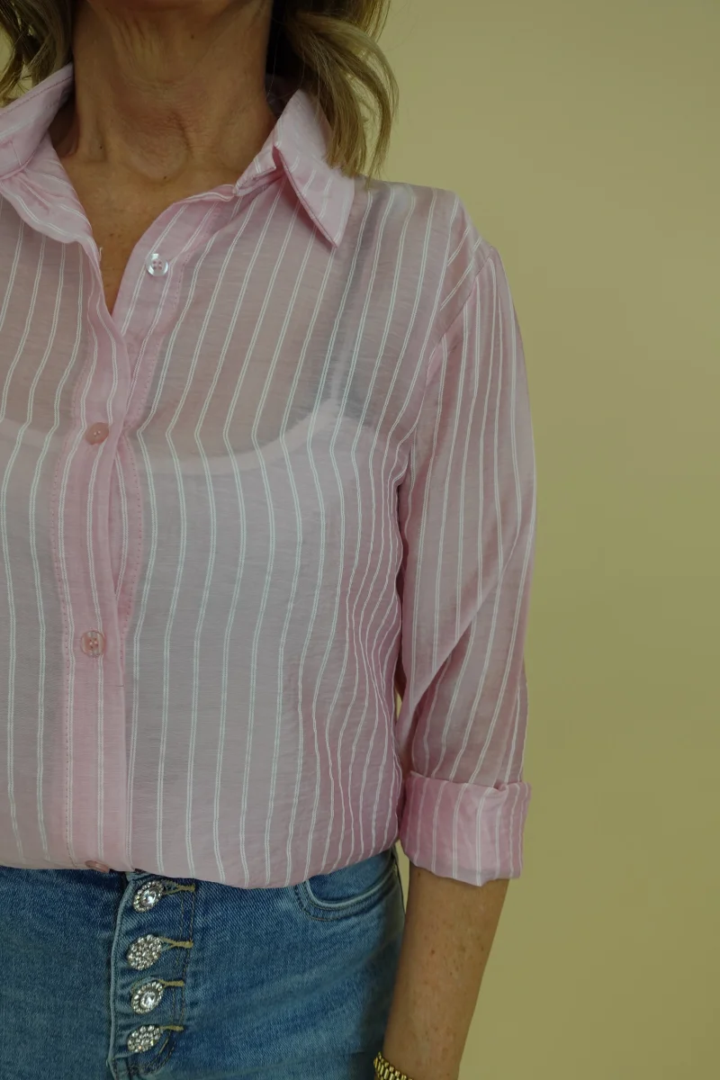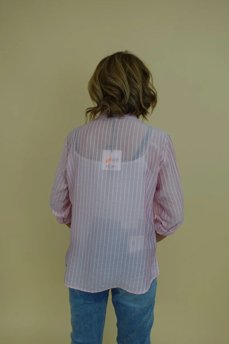 Camicia semitrasparente con riga bianca su sfondo rosa