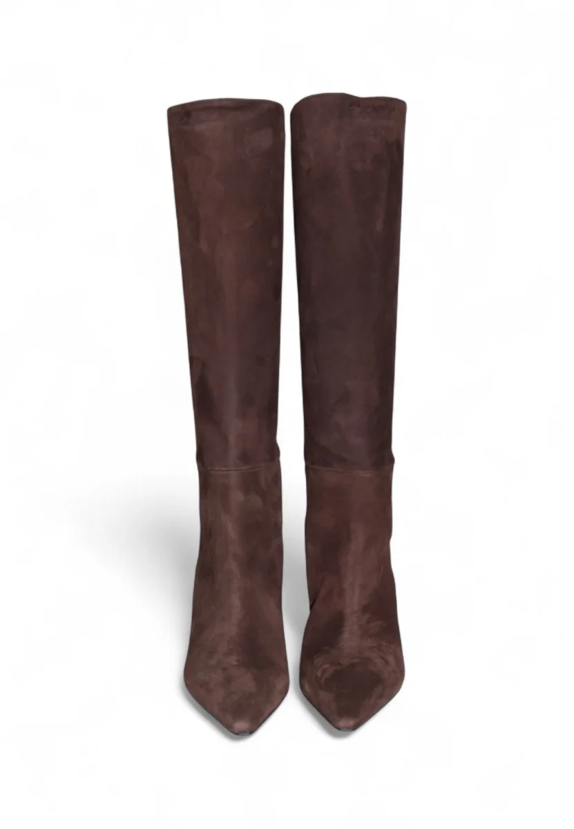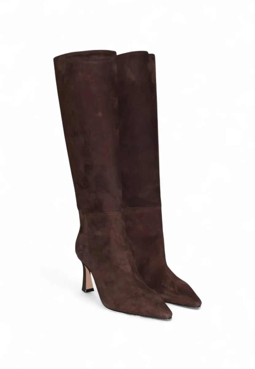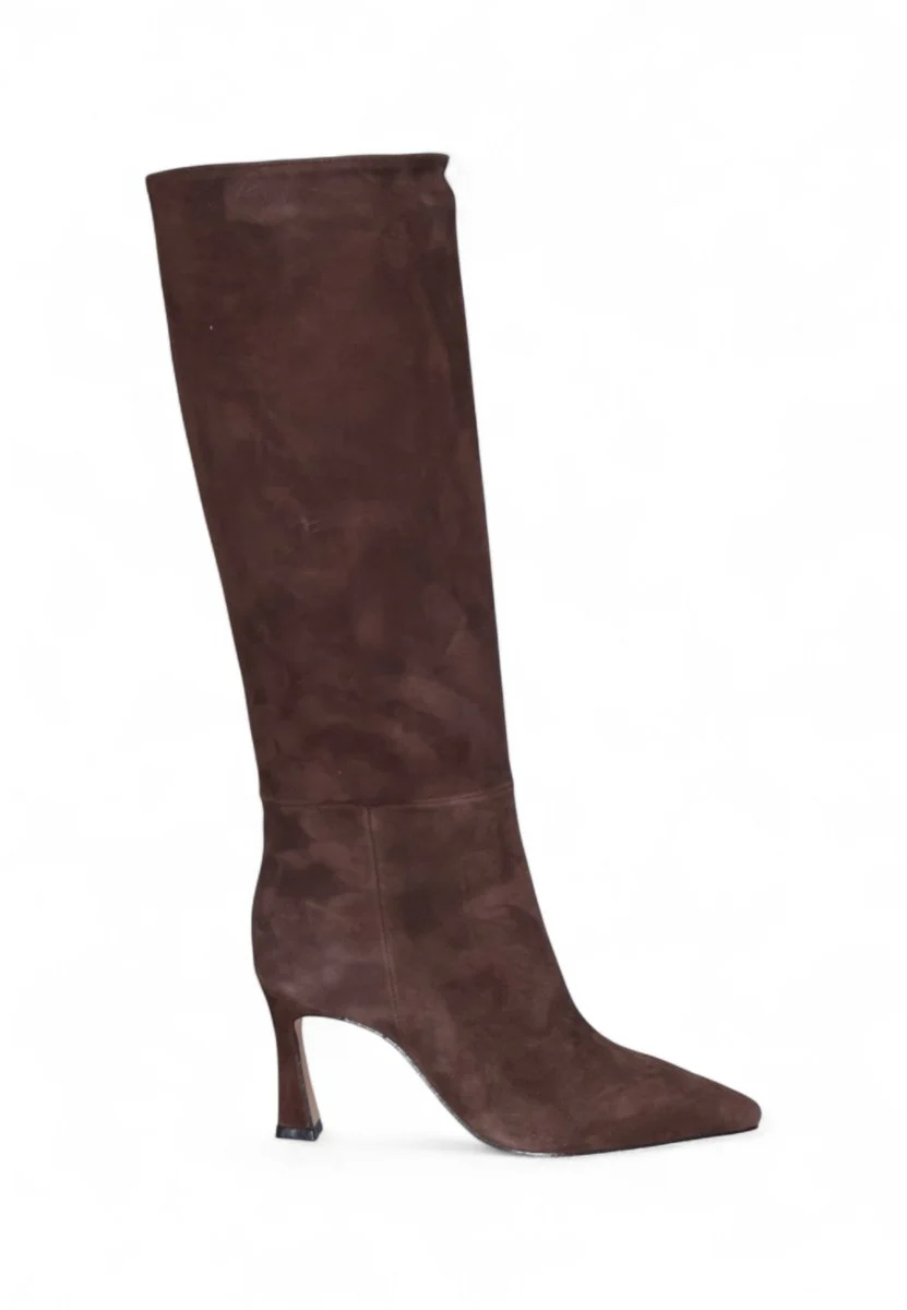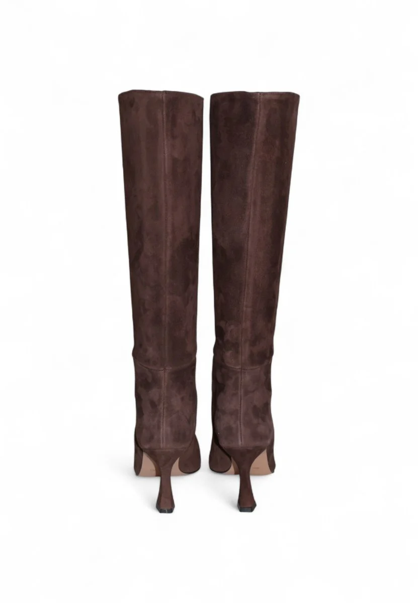 Stivale alto in camoscio marrone caffè, dal gusto caldo e raffinato. Il design essenziale è impreziosito da un tacco da 7 cm che dona slancio alla silhouette senza rinunciare al comfort. Il fondo in cuoio con inserto antiscivolo assicura una camminata stabile e sicura. Ideale per un’eleganza sobria, perfetta in ogni momento della giornata.