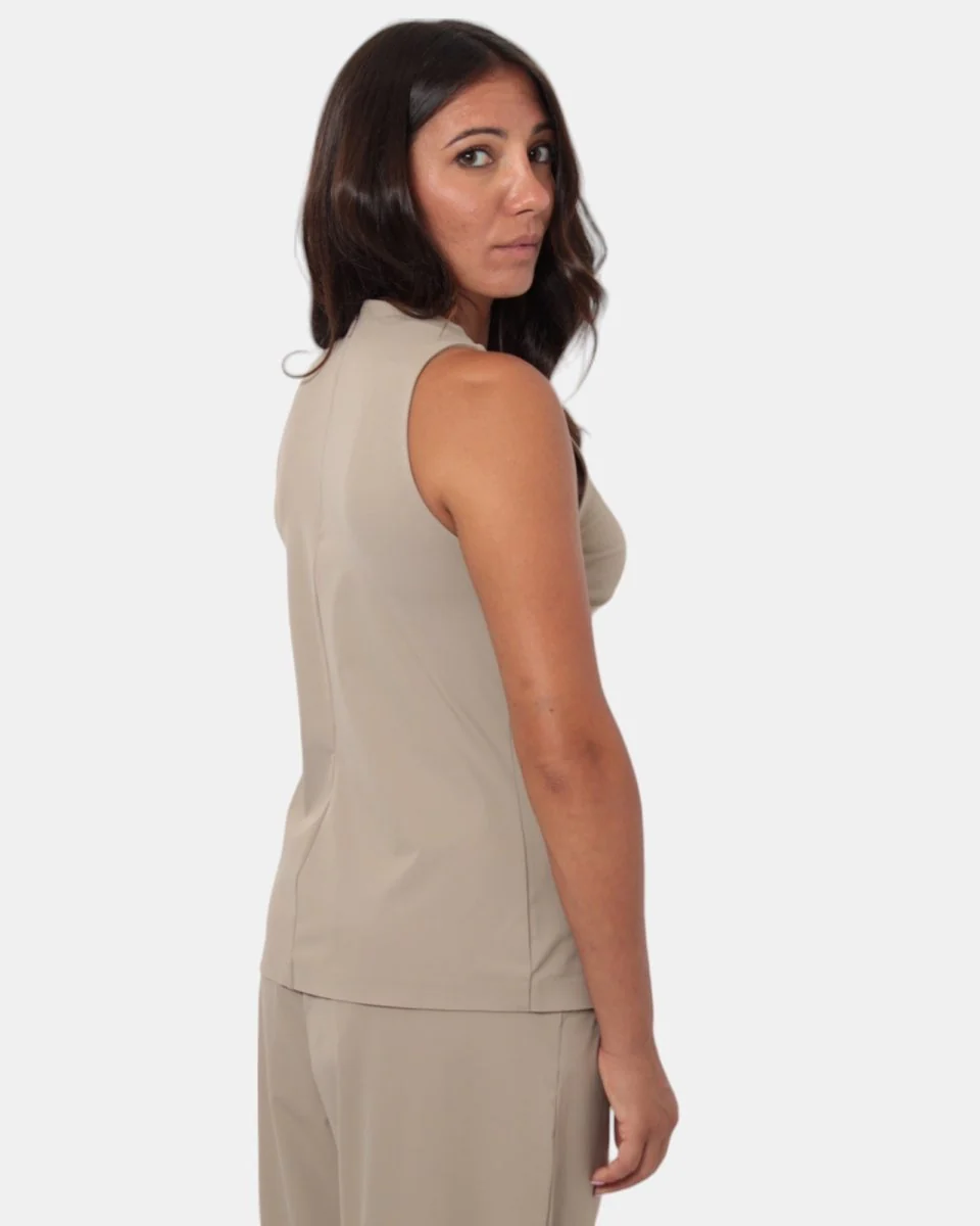 Il design girocollo conferisce un aspetto minimalista e sofisticato, rendendo la canotta versatile e adatta a varie occasioni.