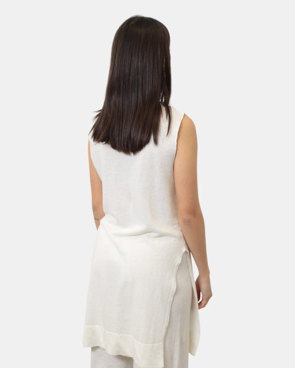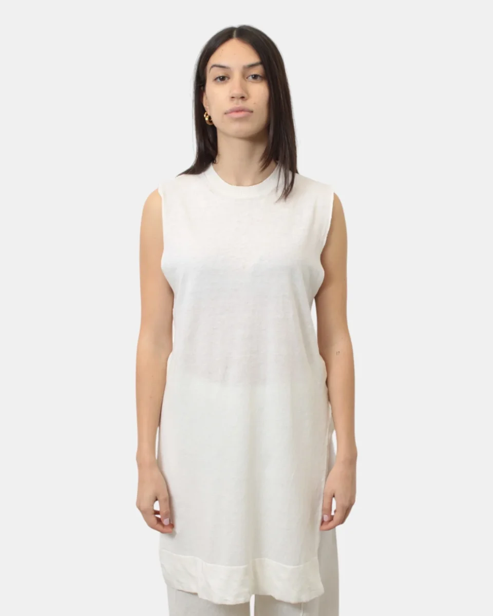La canotta lunga presenta collo e fondo a costine, spacchi laterali, dalla mano fresca dovuta alla sua composizione in 65% lino e 35% cotone. Si consiglia lavaggio a mano. La modella è alta 1,68 m e indossa una S