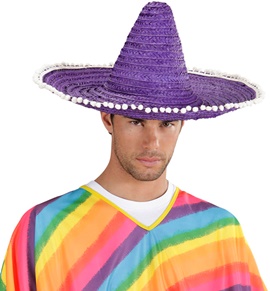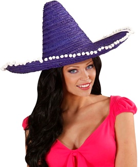 Sombrero 50cm blu in paglia con pom pom bianchi