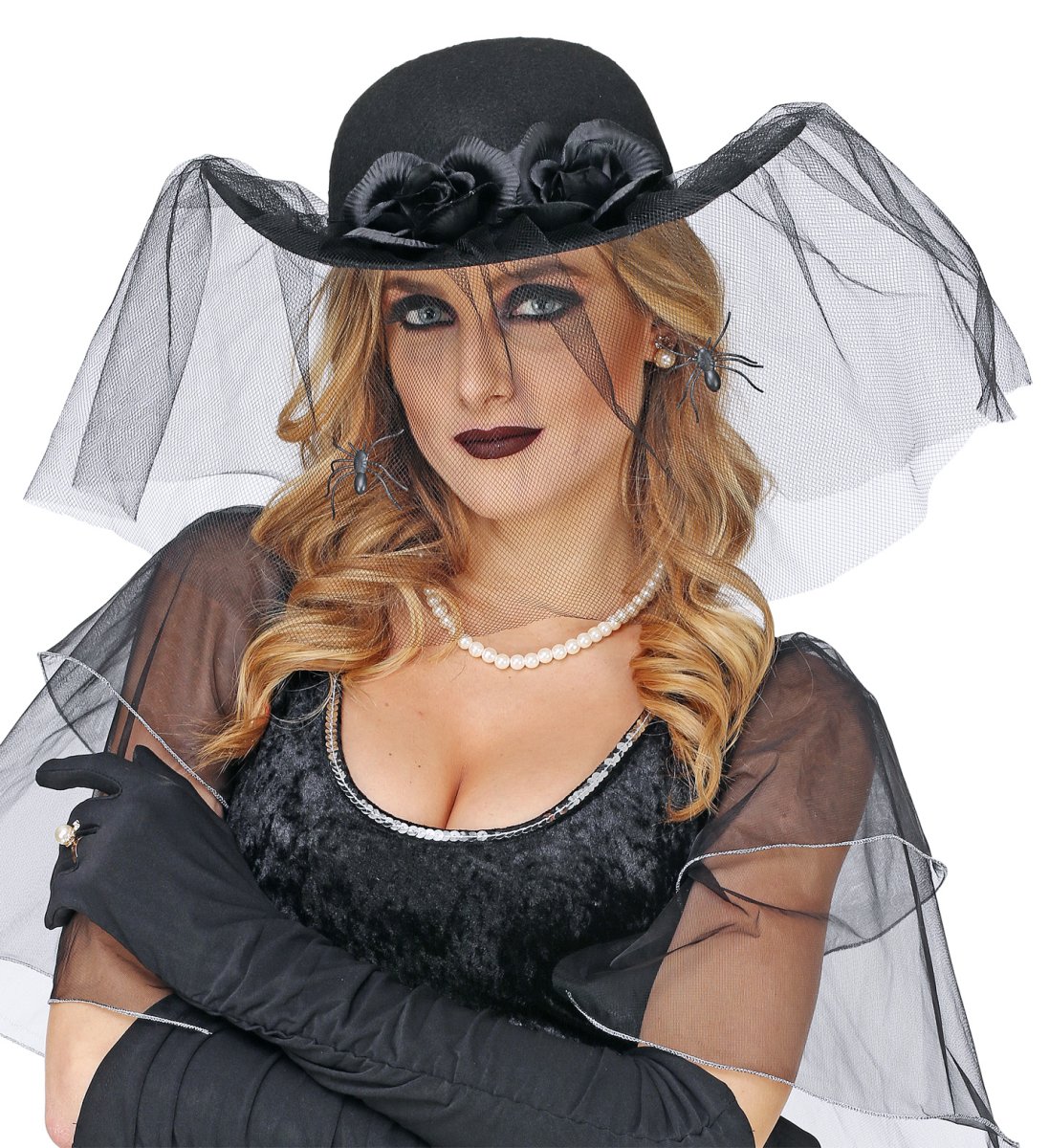 CAPPELLO VEDOVA NERA CON ROSE, VELO E RAGNIAccessori Abbigliamento per adulti Costumi e accessori travestimenti