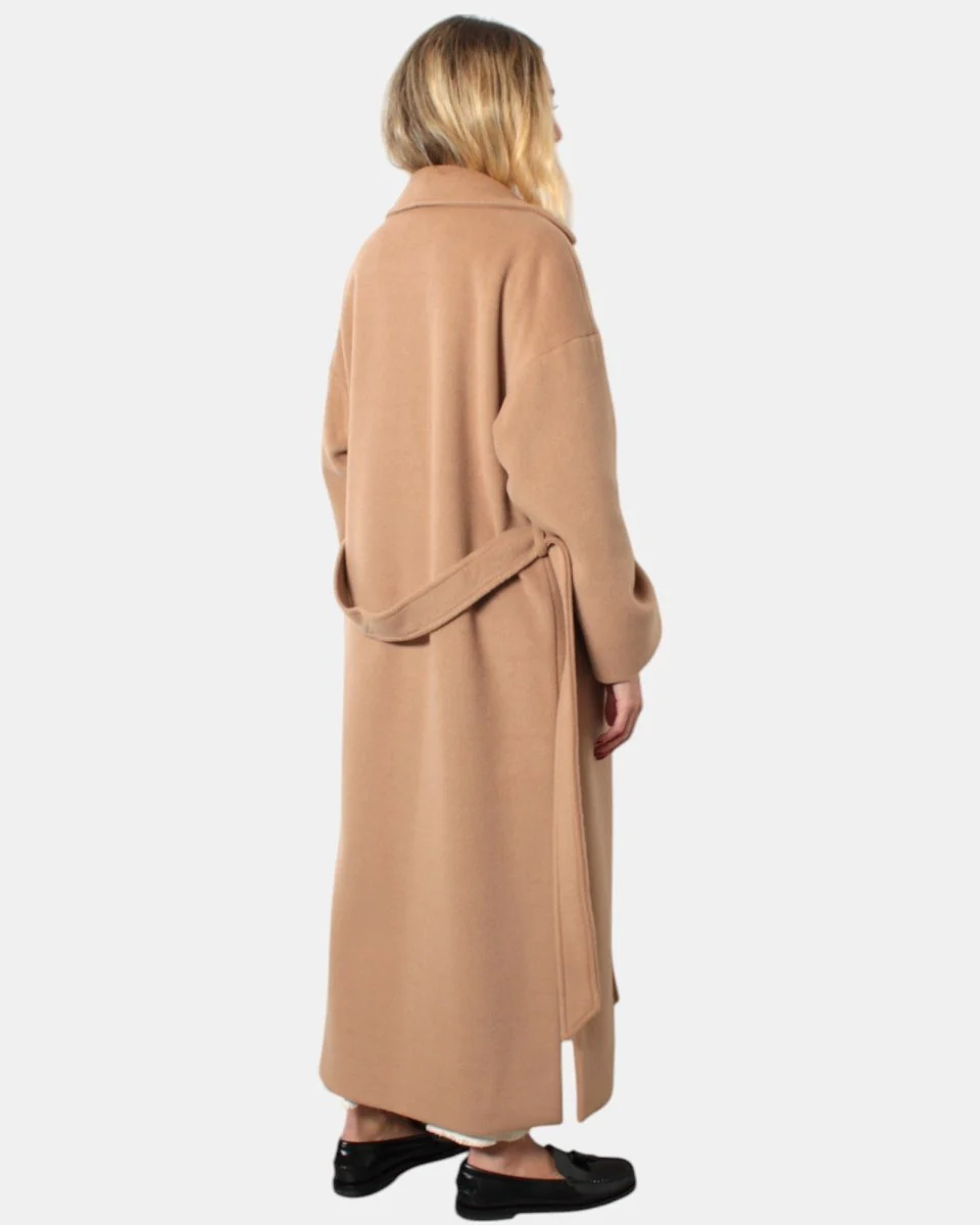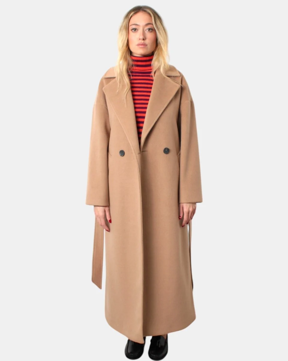 Il cappotto lungo di Capani modello doppiopetto a un bottone con collo e giro sceso con due tasche oblique dalla sua composizione in 90% poliestere e 10% viscosa. Si consiglia lavaggio a secco . La modella è alta 1,70 m e indossa una 40