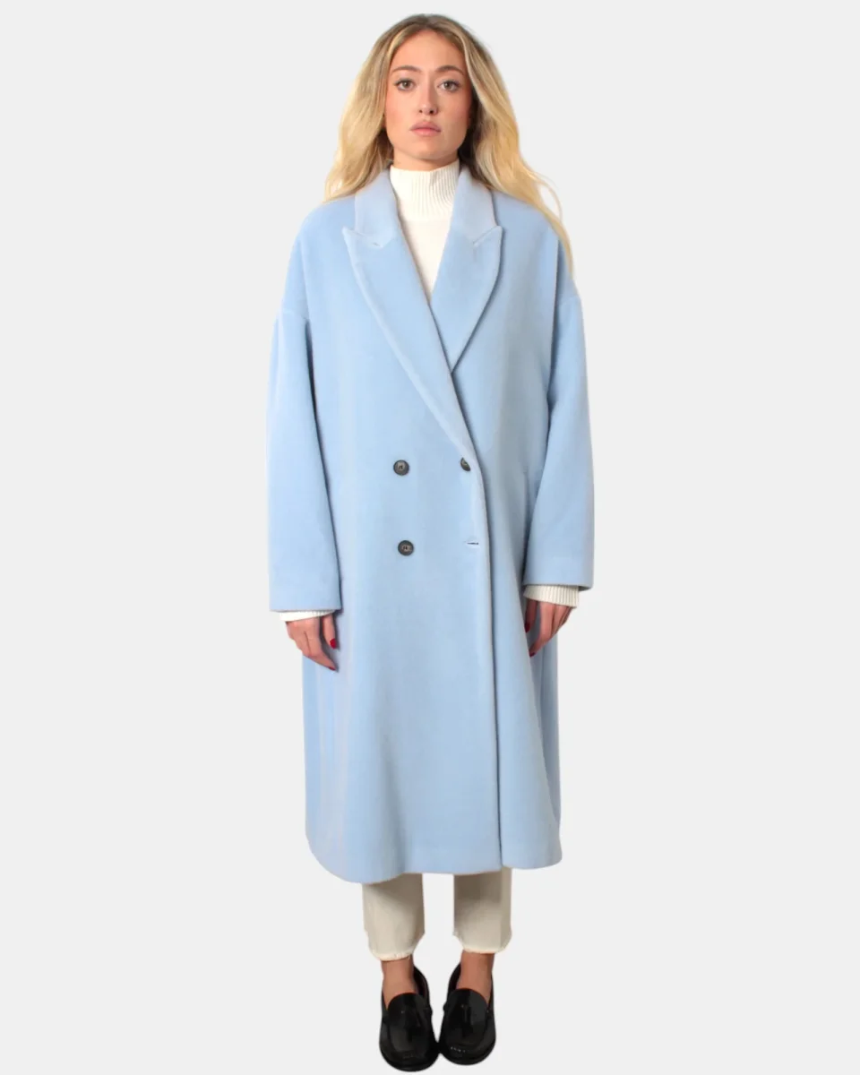 Il cappotto di ”ANNIEPARIS” presenta doppiopetto quattro bottoni con rever a lancia, due tasche a filo laterali, giro sceso e vestibilità over, caratterizzato da un tessuto morbido e peloso dovuto dalla sua composizione in 100% lana. Si consiglia lavaggio a secco. La modella è alta 1,70 m e indossa una 40