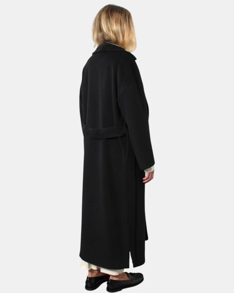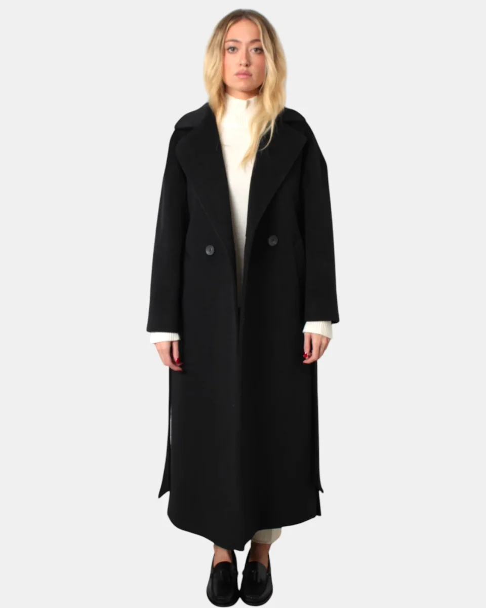 Il cappotto lungo di Capani modello doppiopetto a un bottone con collo e giro sceso con due tasche oblique dalla sua composizione in 90% poliestere e 10% viscosa. Si consiglia lavaggio a secco . La modella è alta 1,70 m e indossa una 40