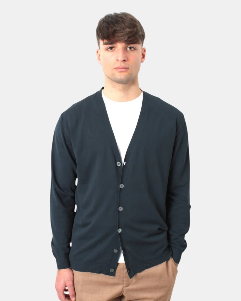 Il cardigan di Daniele Fiesoli presenta chiusura a sei bottoni, collo, polso e fondo a costine, dalla mano fresca dovuta alla sua composizione in 100% cotone. Si consiglia lavaggio a mano. Il modello è alto 1,78 m e indossa una L