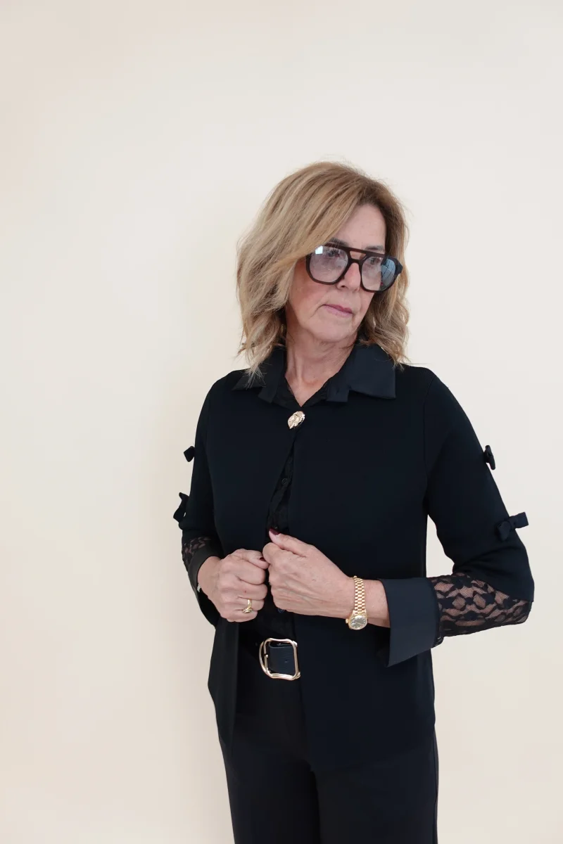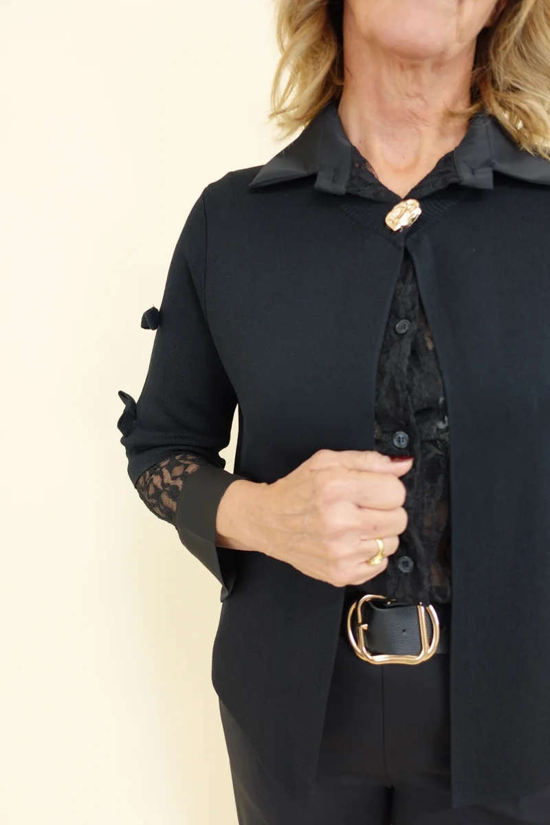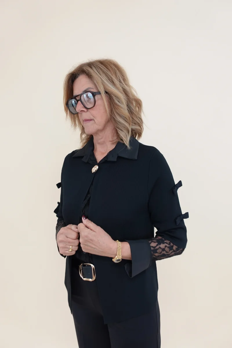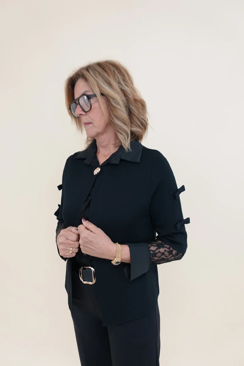 Cardigan con bottone frontale, fiocchettini sulle maniche