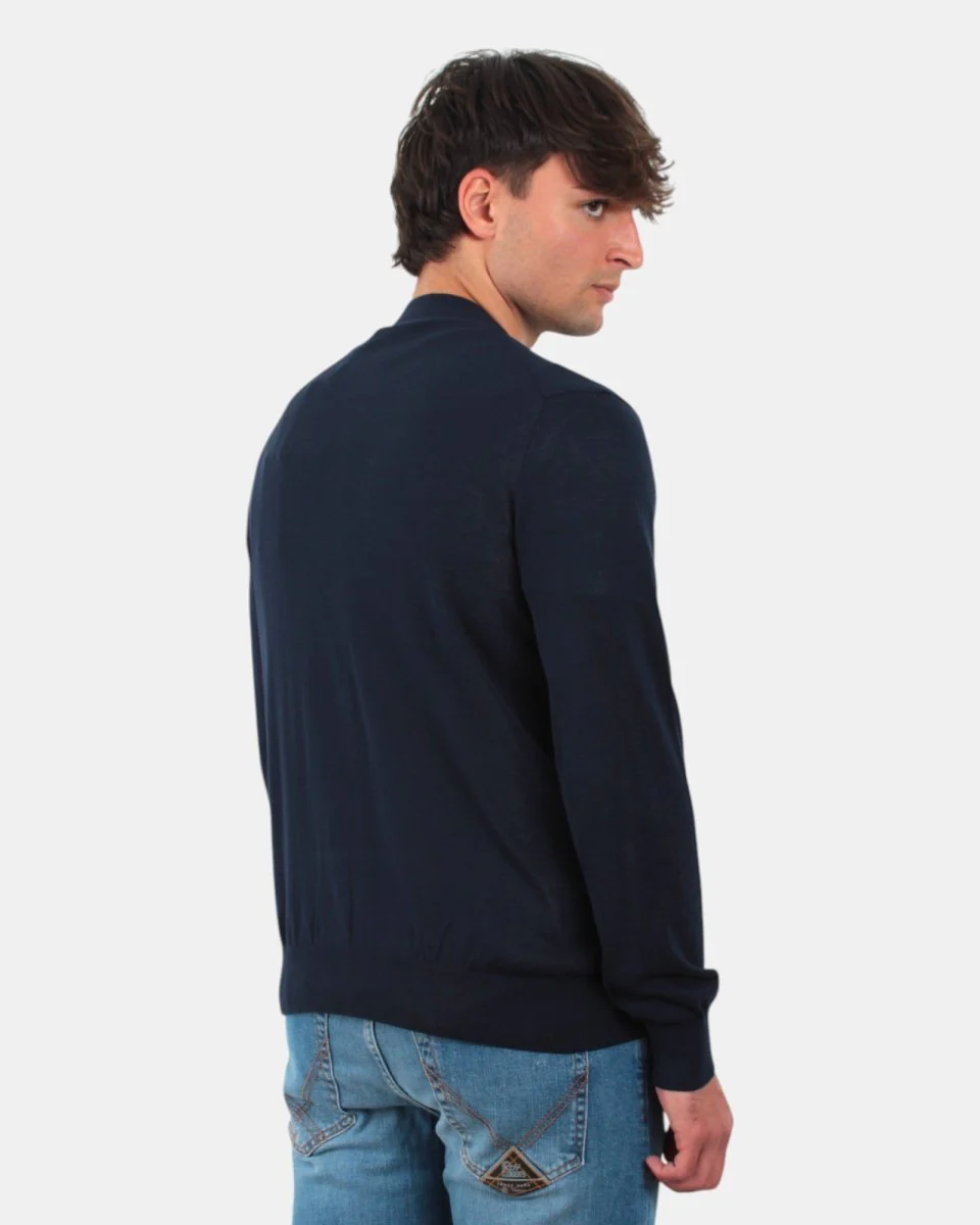 Il cardigan di Della spiga presenta fantasia monocolore, chiusura a quattro bottoni, fondo, collo e polsi a costine, dalla mano fresca dovuta alla sua composizione in 100% cotone. Il modello è alto 1,78 m e indossa una 48