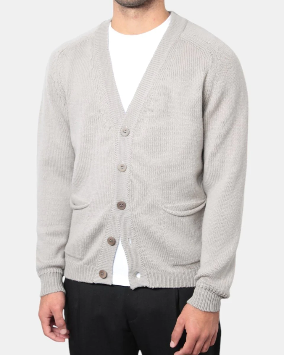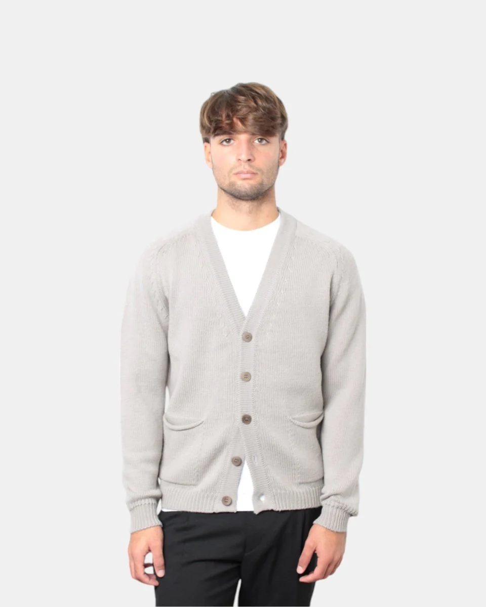Il cardigan di Daniele Fiesoli dalla lavorazione calata in finezza cinque presenta la sua composizione in 100% lana merino che garantisce un ottimo calore in inverno.