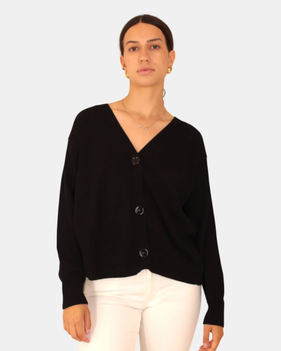 Il cardigan di SOLOTRE presenta una vestibilità over, maniche lunghe e scollo a V. Dotato di chiusura con bottoni e spacco laterale, è realizzato in 100% cotone. Si consiglia lavaggio delicato a massimo 30 gradi. La modella è alta 1,68 m e indossa una taglia 2.