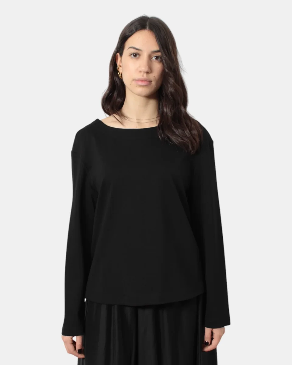 La maglia a girocollo a maniche lunghe di Solotre presenta fantasia monocolore, giro sceso, dalla mano morbida dovuta alla sua composizione in 70% viscosa, 22% poliestere e 8% elastan. Si consiglia lavaggio a secco. La modella è alta 1,68 m e indossa una 40