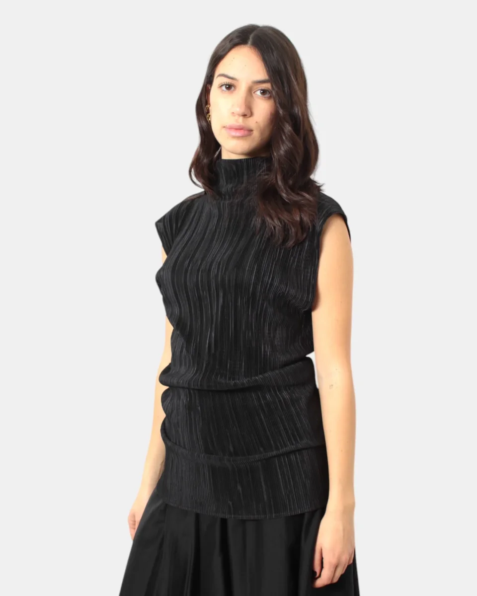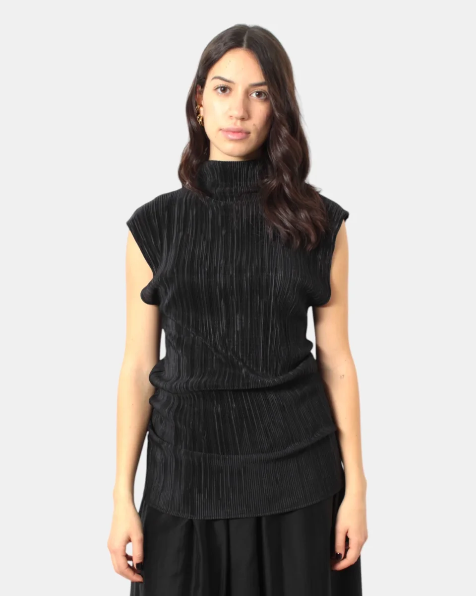 La casacca di Solotre presenta collo alto, fantasia con pieghette verticali, dalla mano fresca dovuta alla sua composizione in 100% poliestere. Si consiglia lavaggio a mano. La modella è alta 1,68 m e indossa una 40
