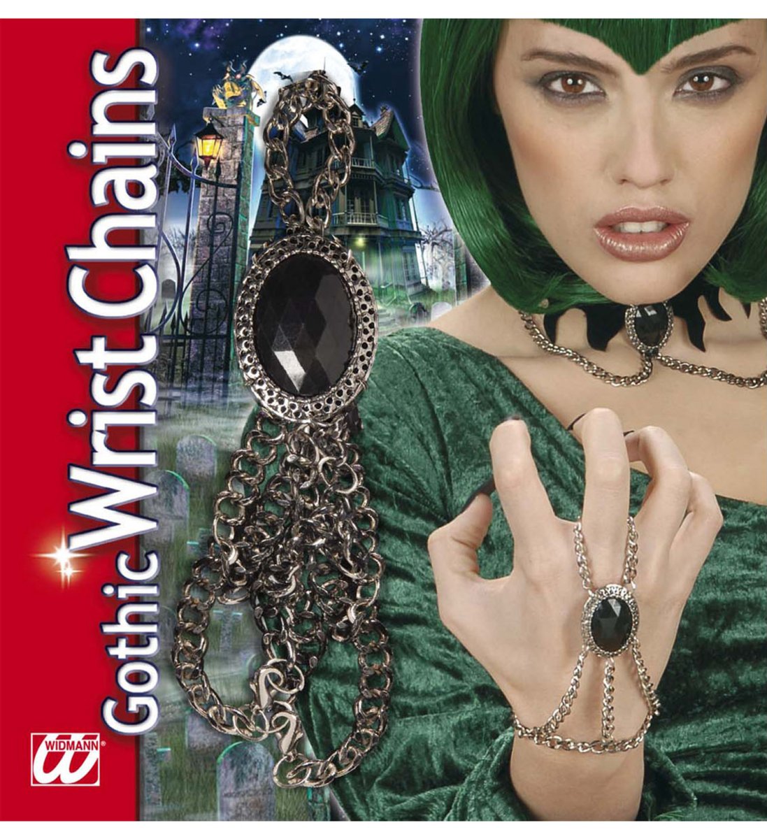 CATENA PER POLSO GOTICA CON MEDAGLIONE GEMMA NERA Accessorio,Bigiotteria,Travestimento,Halloween,Carnevale