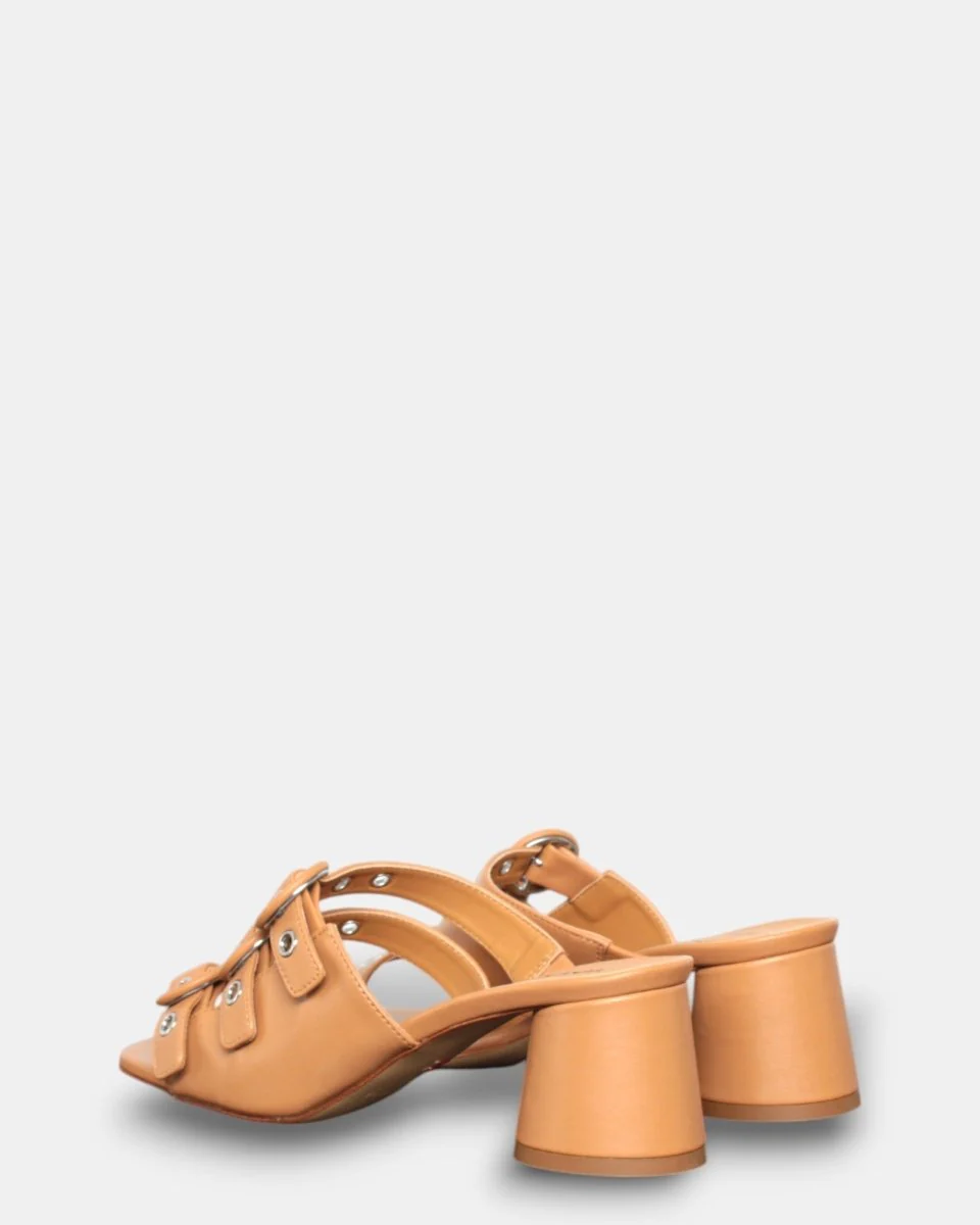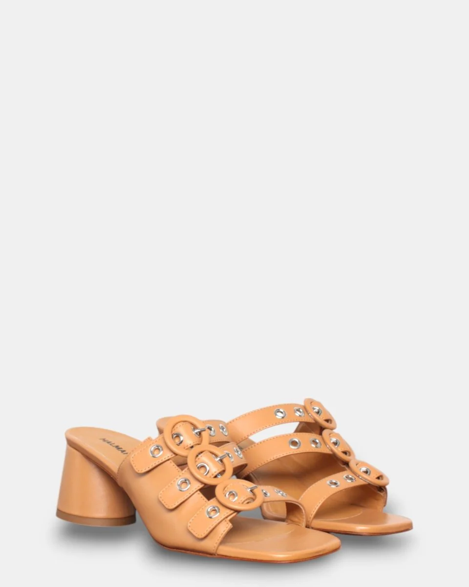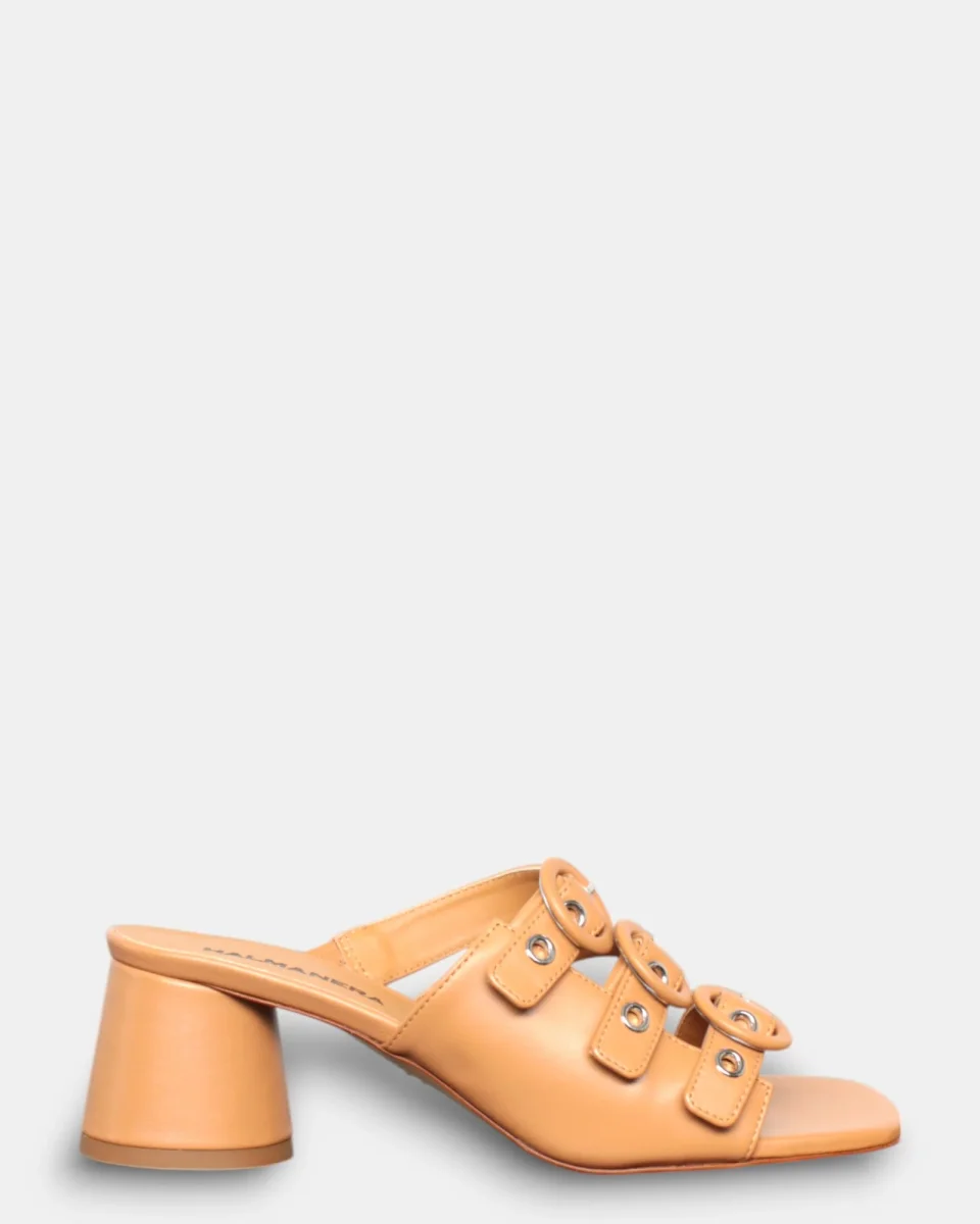La ciabatta di Halmanera presenta tre fibbiette in argento nella parte centrale borchiate, tomaia in pelle, tacco 5 cm, calzata regolare