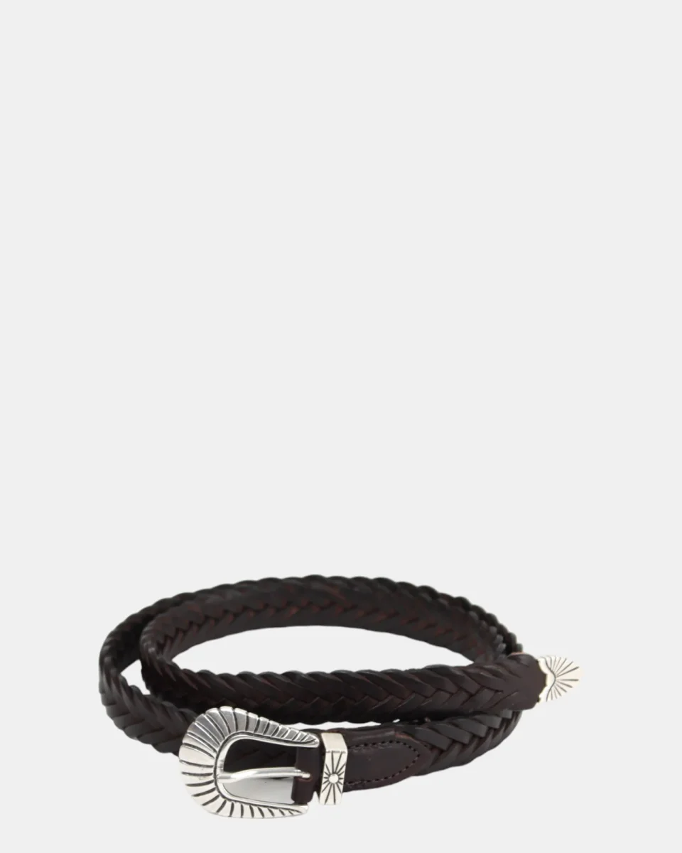 La cintura di Alberto Luti presenta:– DETTAGLI: intrecciata a mano, Altezza cm 3 con fibbia e passante in metallo inciso in finitura argentata– COMPOSIZIONE: pelle