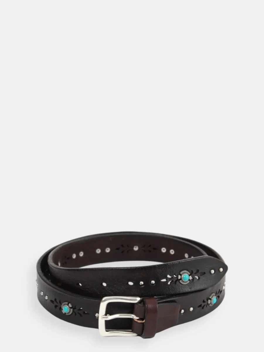 – DETTAGLI: realizzata in pelle, borchie, pietra colore turchese incastonata in un decoro inciso e fibbia in metallo color argento. Altezza: 3 cm. La misura della cintura indica la distanza tra il buco centrale e la fine della cinghia