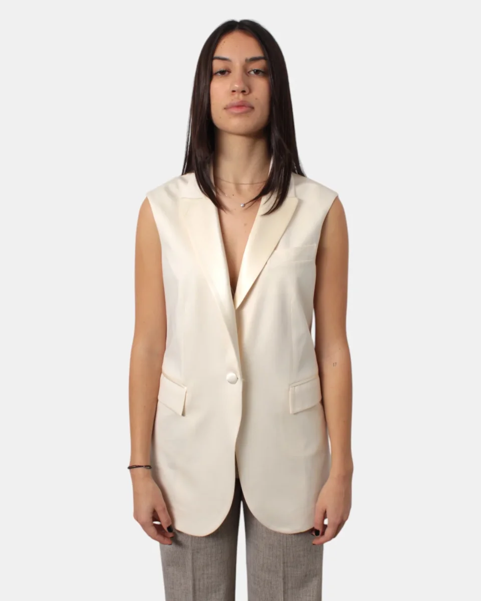 Il gilet di Circolo doppiopetto presenta due tasche a filo con pattina, spacco centrale sul retro, dalla mano morbida e soffice dovuta alla sua composizione in 94% cotone e 6% elastan. Si consiglia lavaggio a mano. La modella è alta 1,68 m e indossa una 38